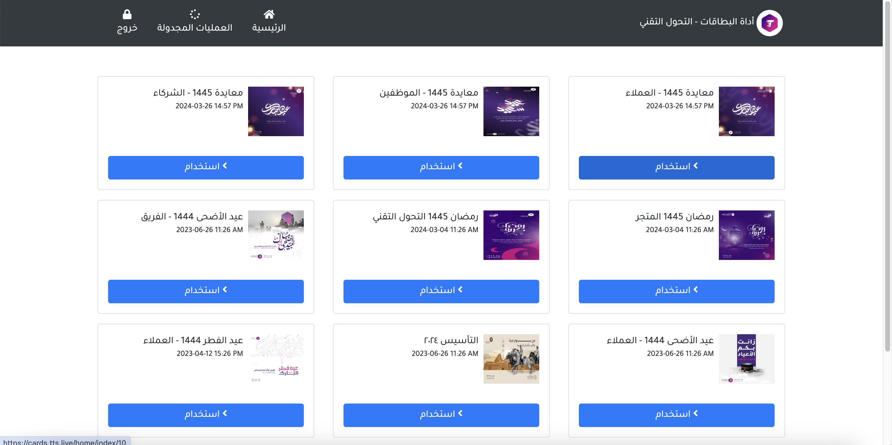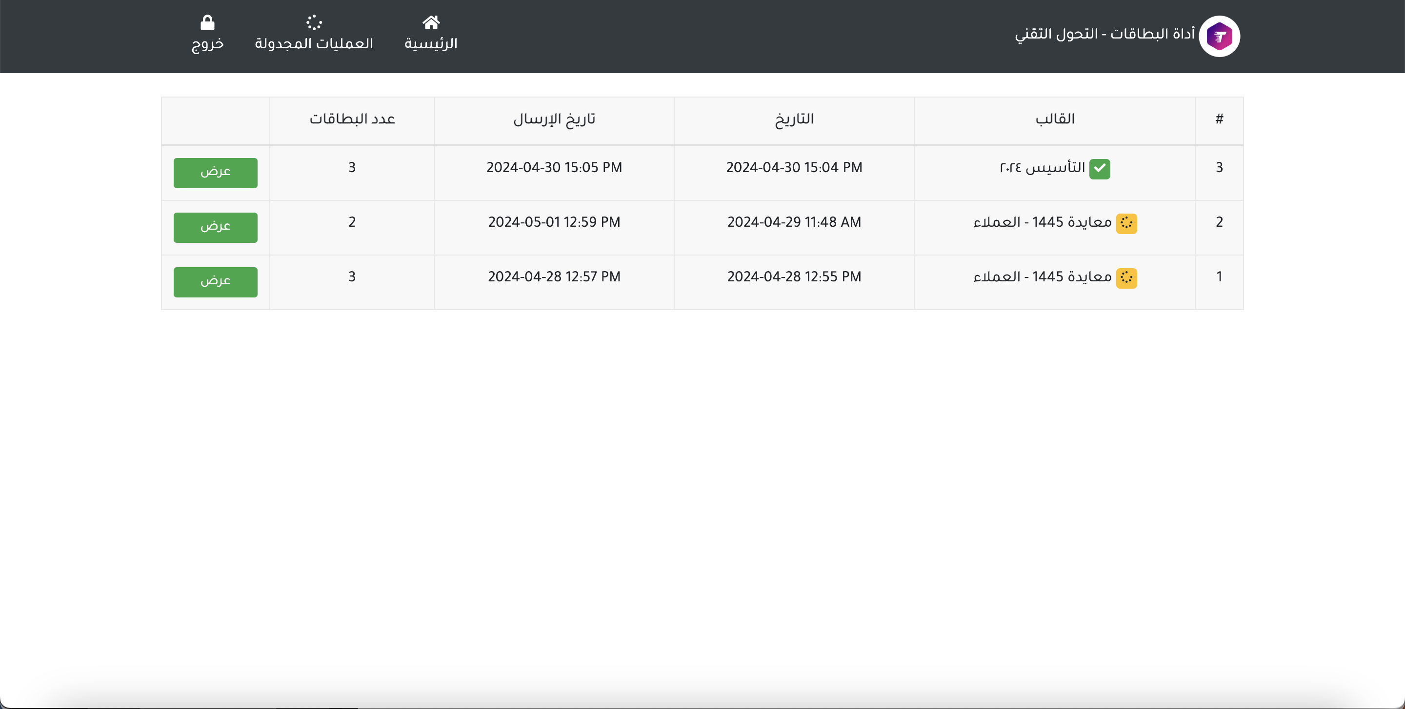- عند الضغط على توليد البطاقات سيتم مباشرة توليدها وظهورها في صفحة العمليات المجدولة بإمكانك التحقق من جميع البيانات المحدده واستعراض القالب.
