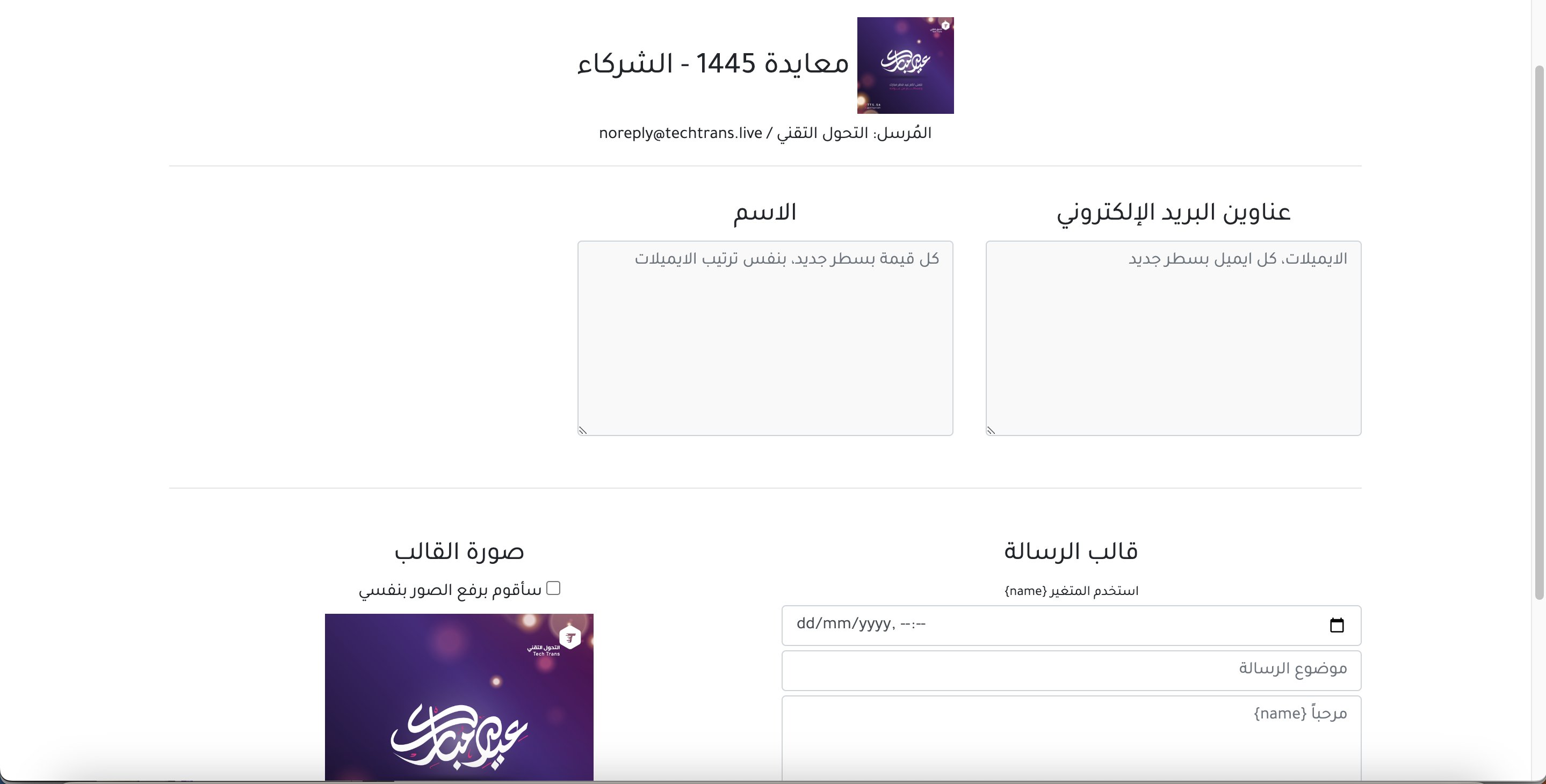- قالب الرسالة: يتم تحديد التاريخ الوقت المُراد ارسال القالب فيه وموضوع الرسالة والمحتوى.