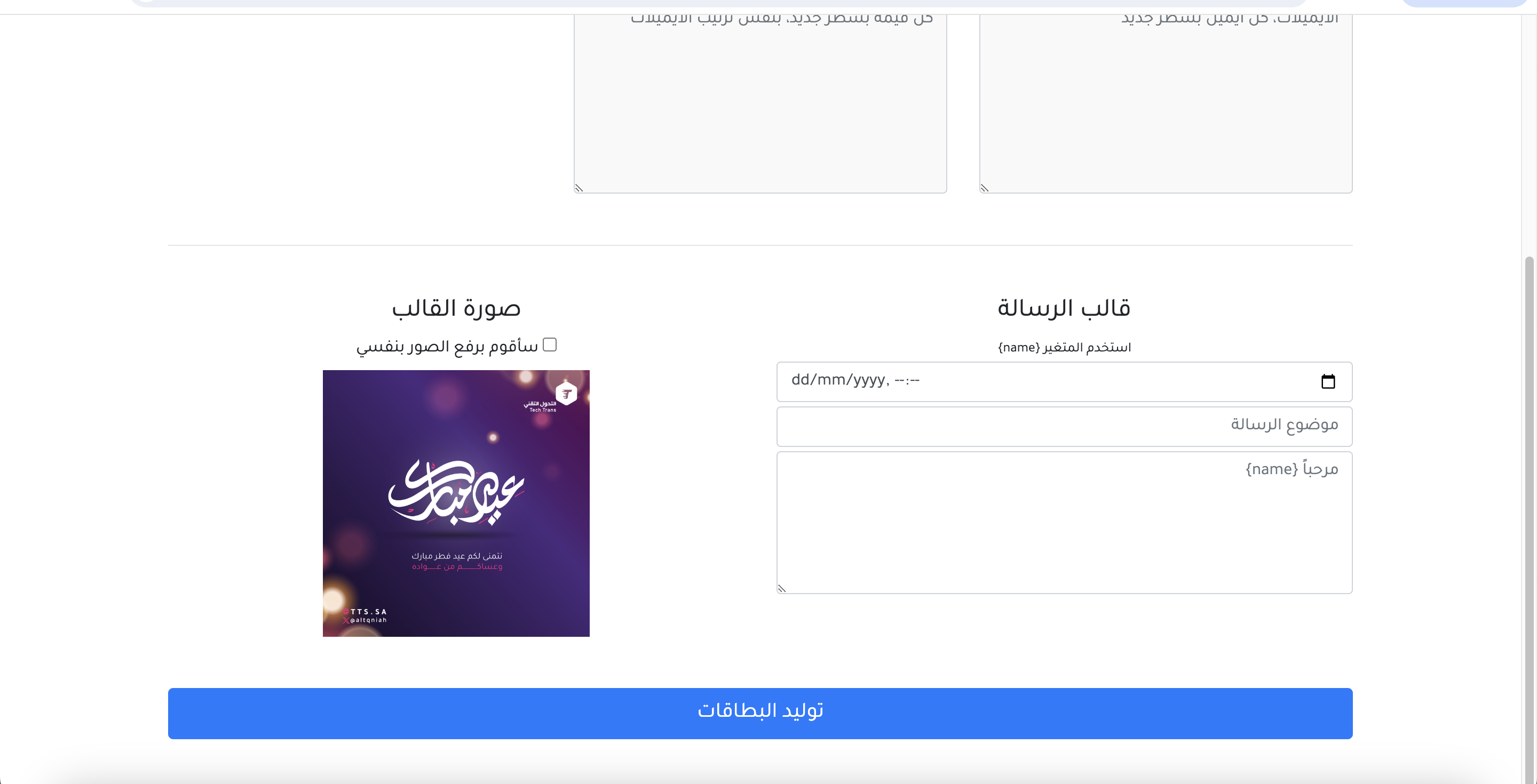 - المعاينة والإرسال: يمكن للمستخدم معاينة البطاقة قبل إرسالها، ثم كتابة البريد الالكتروني الخاص بالمستلمين وإرسالها مباشرة عبر النظام.