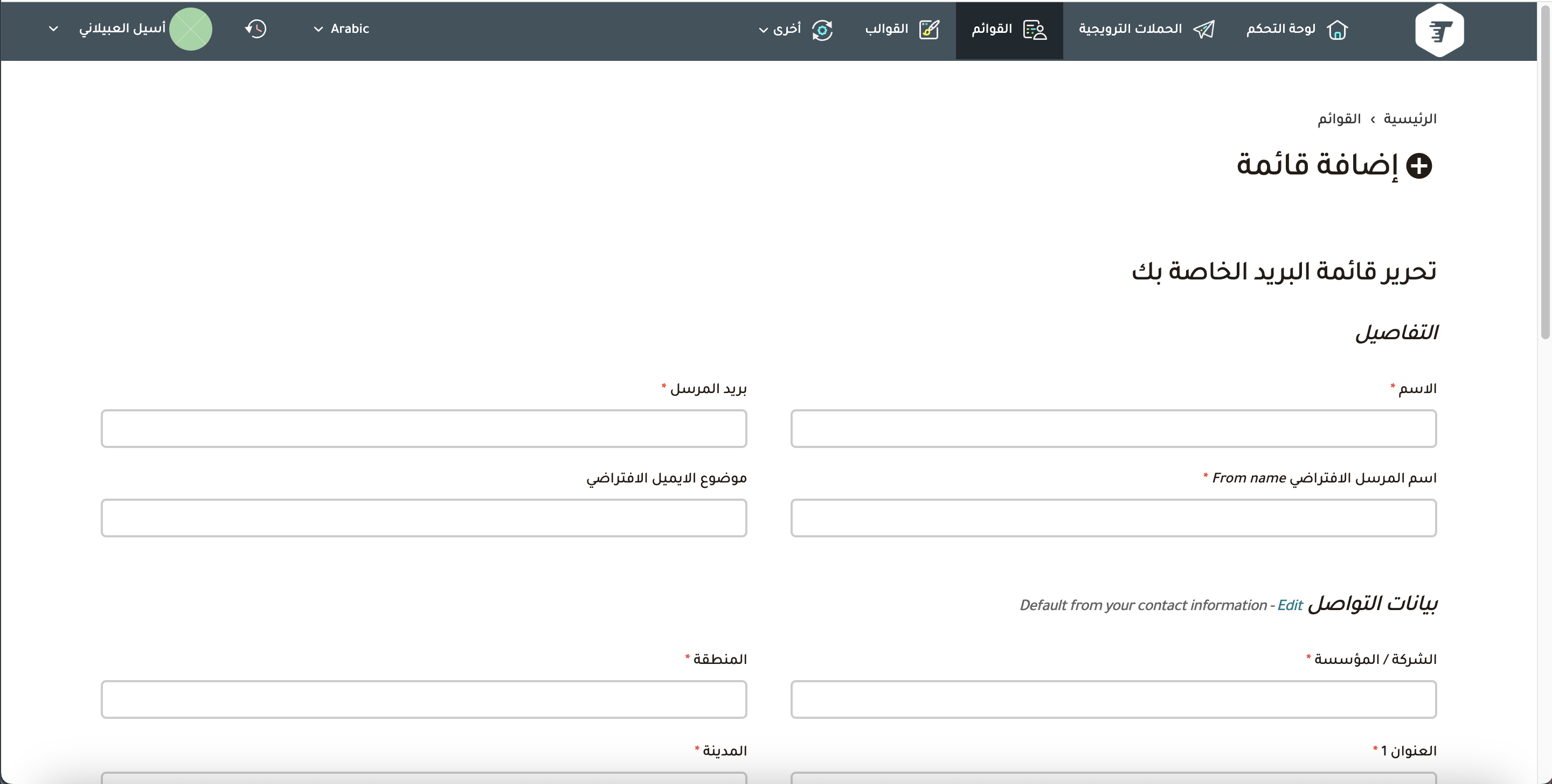 - إضافة قائمة: من القائمة العلوية > القوائم > إضافة قائمة.