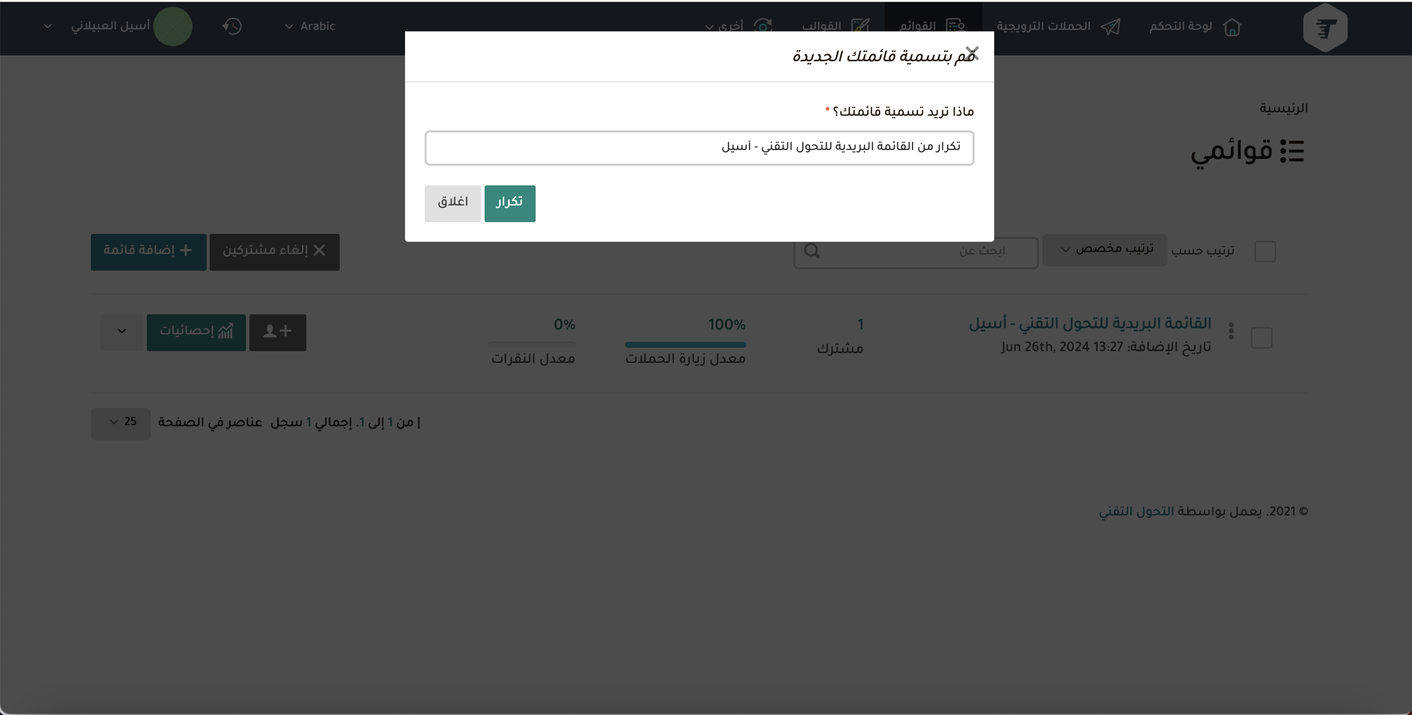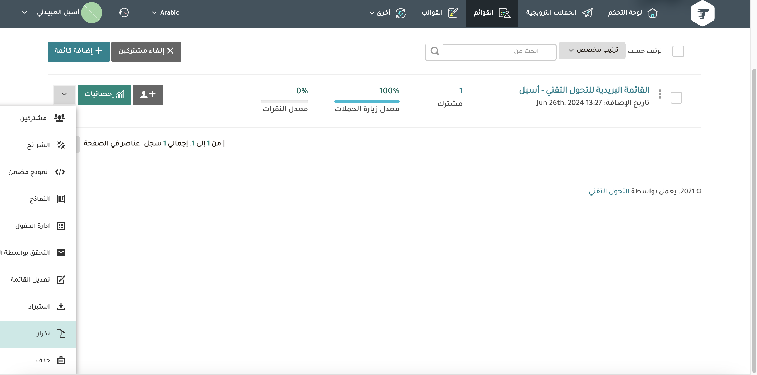- تكرار القائمة البريدية: من القائمة العلوية > القوائم > إجراءات على القائمة.