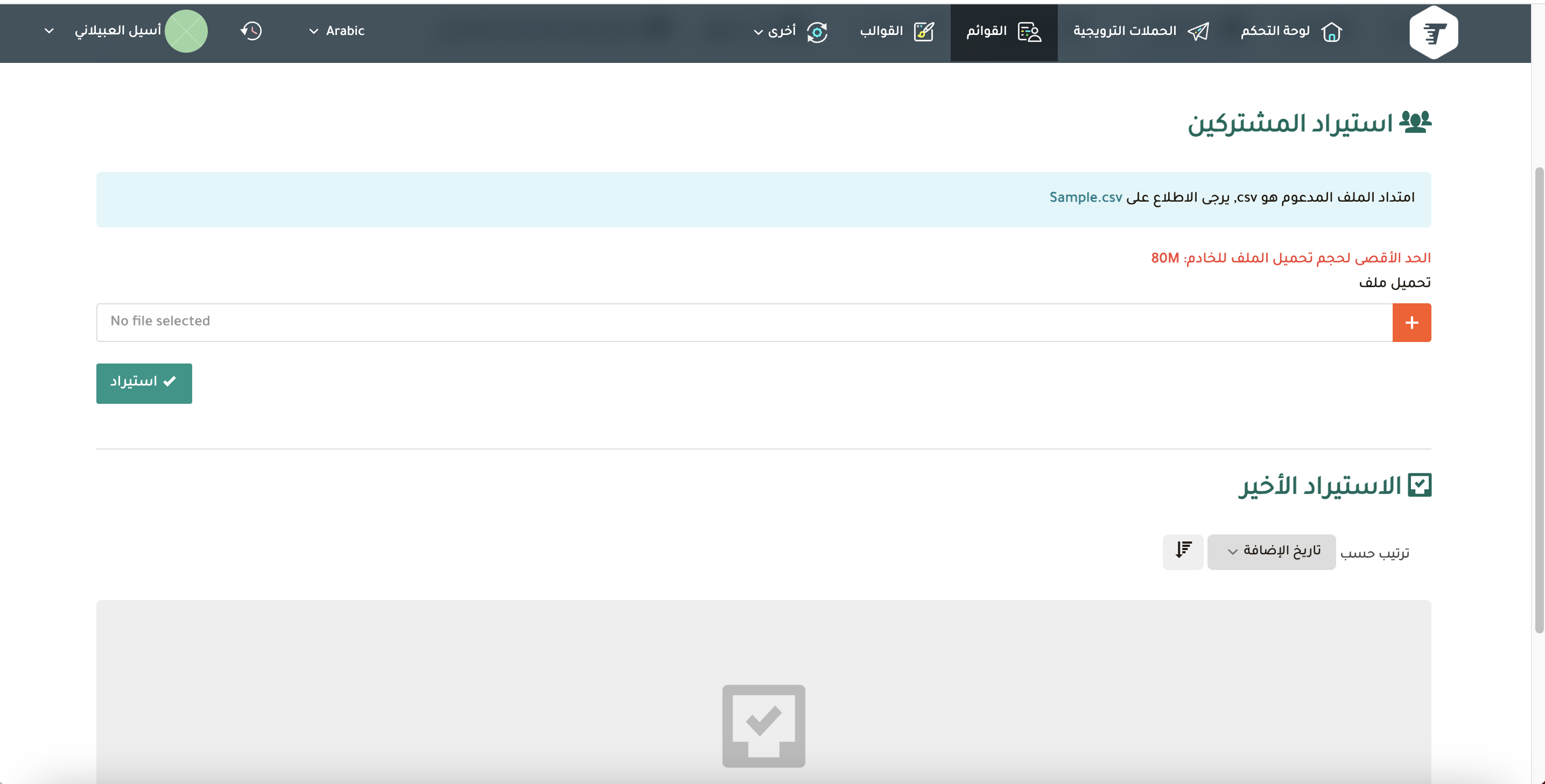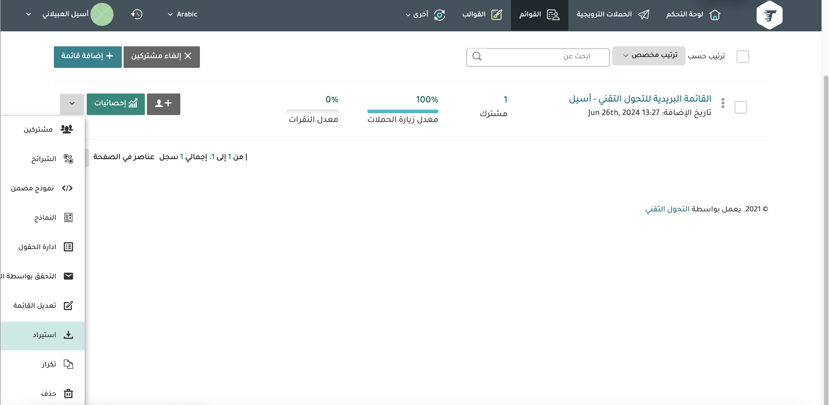 - استيراد المشتركين: من القائمة العلوية > القوائم > إجراءات على القائمة.
