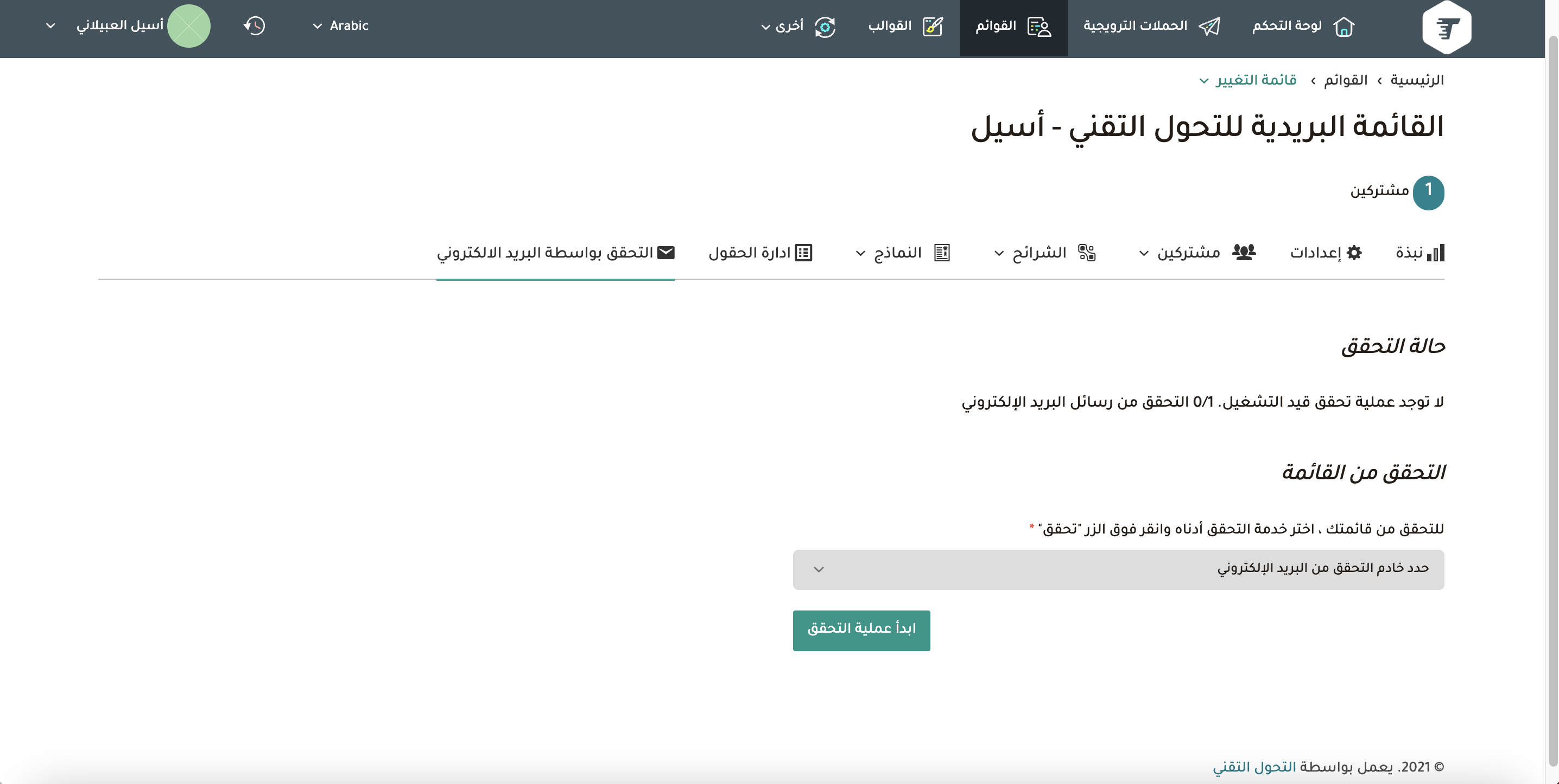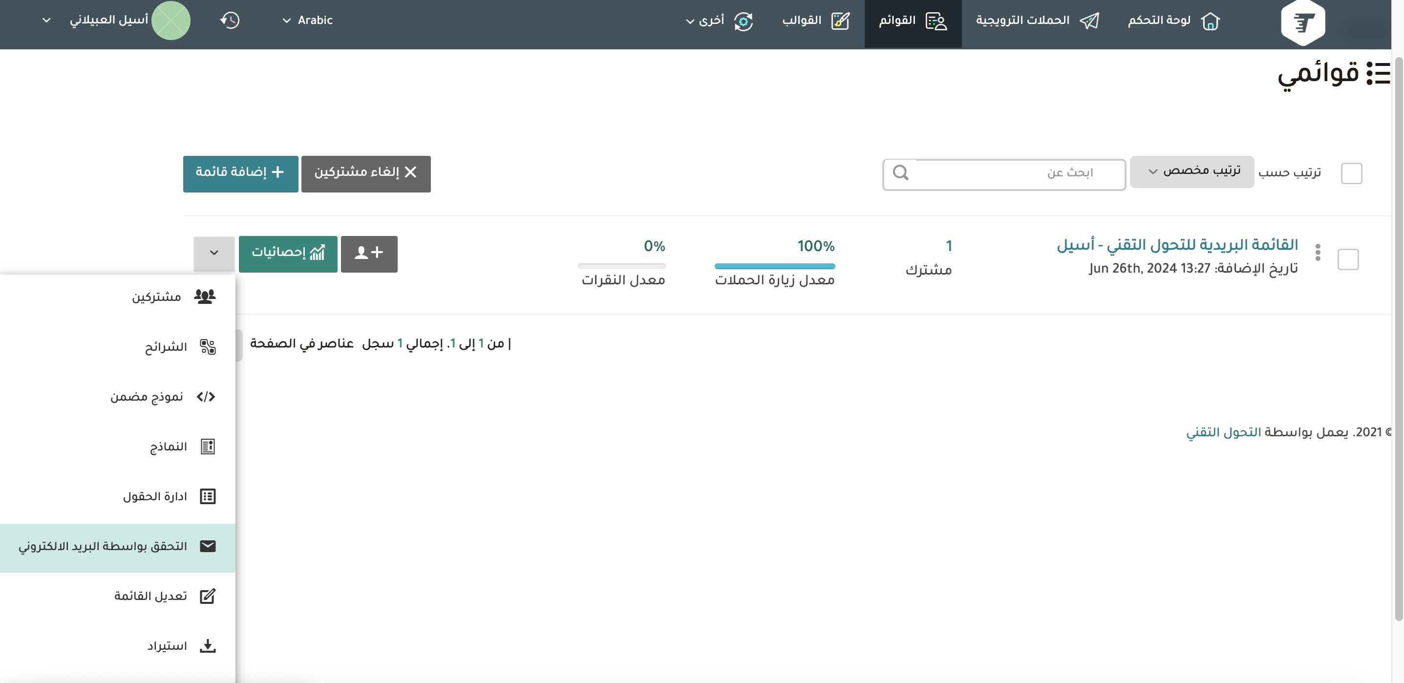 - التحقق بواسطة البريد الإلكتروني: من القائمة العلوية > القوائم > إجراءات على القائمة.