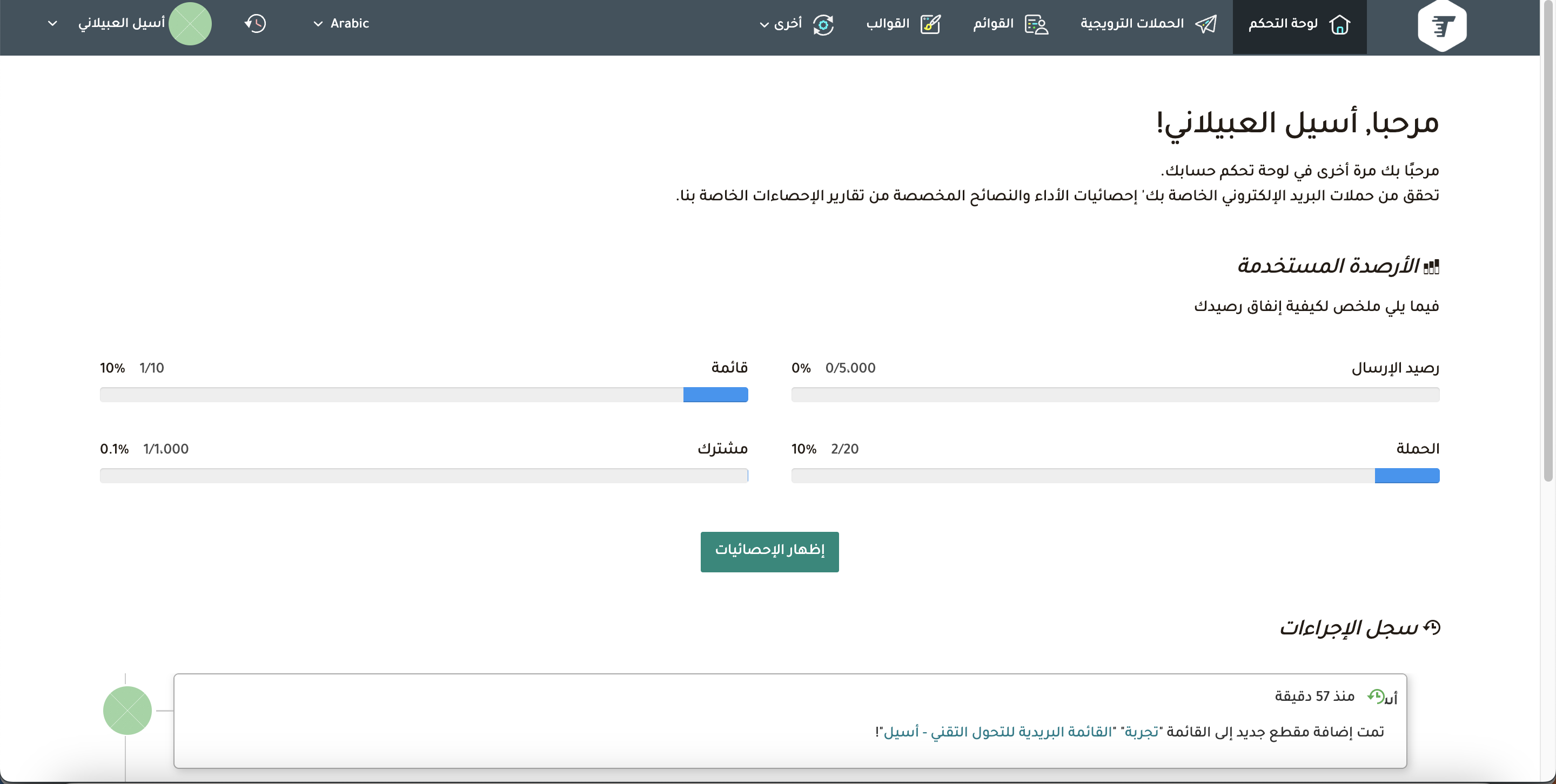 - لوحة التحكم: يتم عرض الاحصائيات الخاصة بحسابك وسجل الاجراءات.