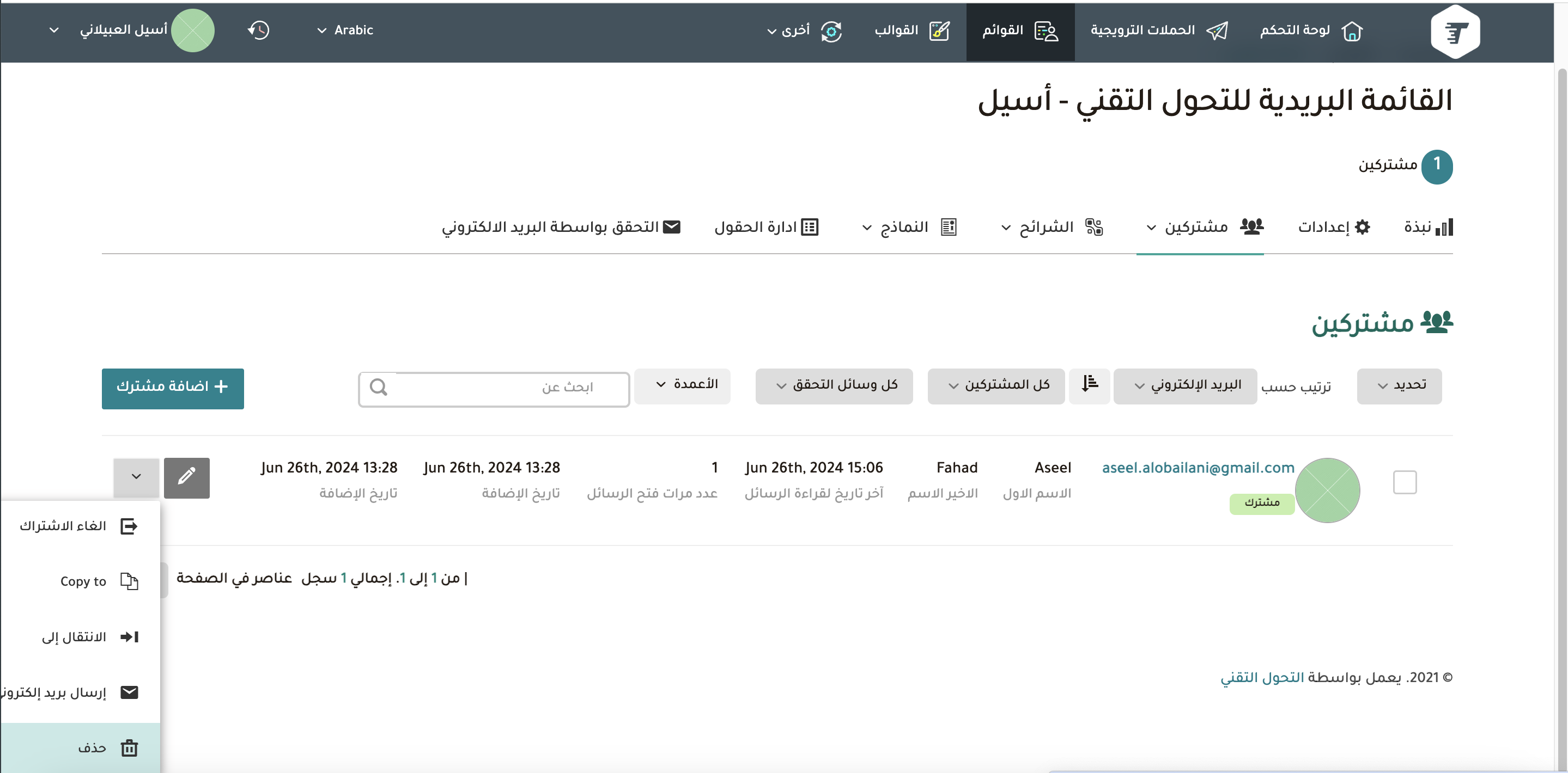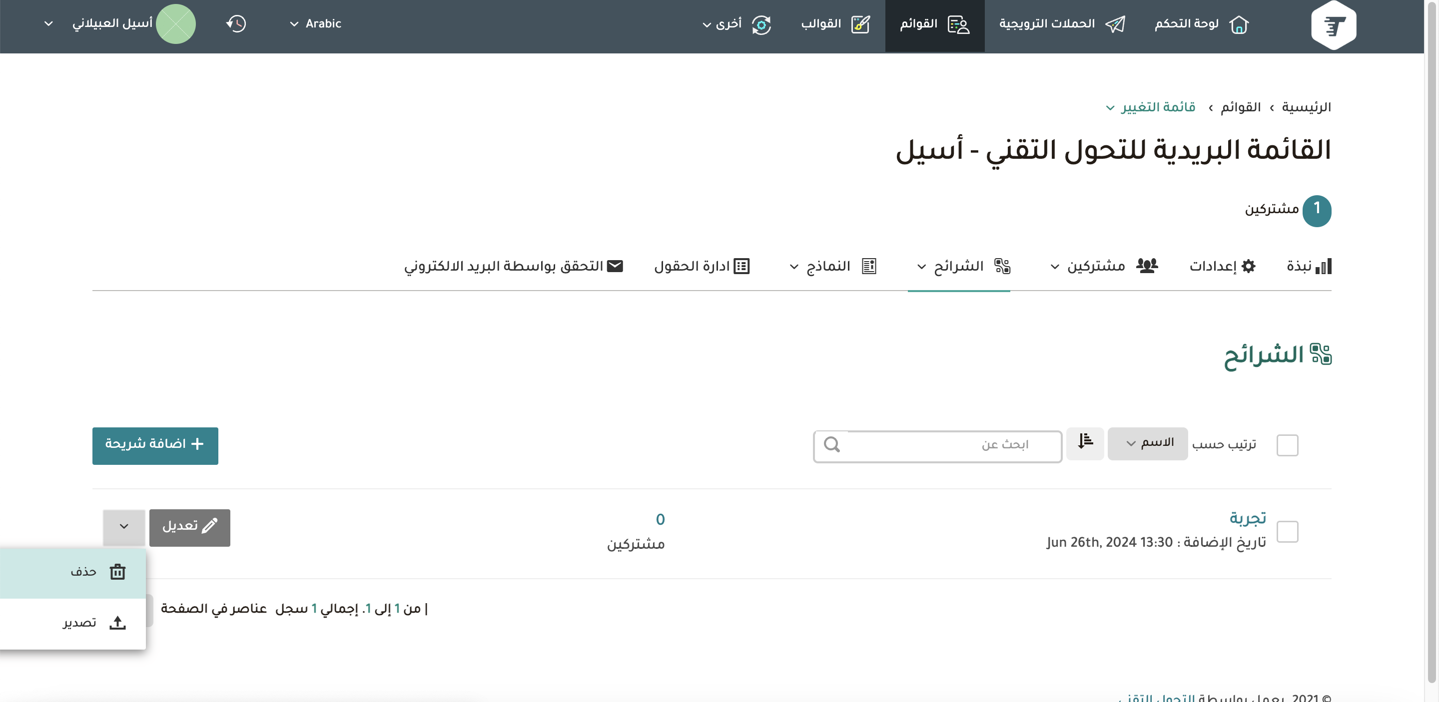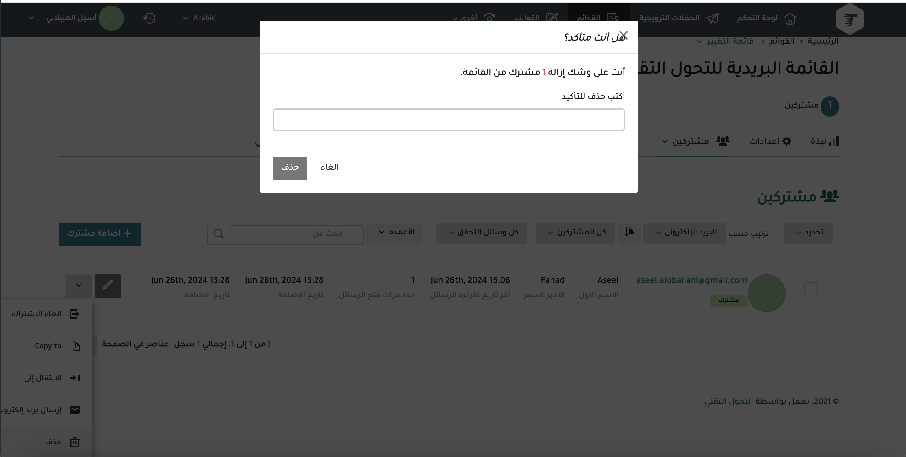 - حذف مشترك: من القائمة العلوية > القوائم > إجراءات على القائمة > المشتركين.