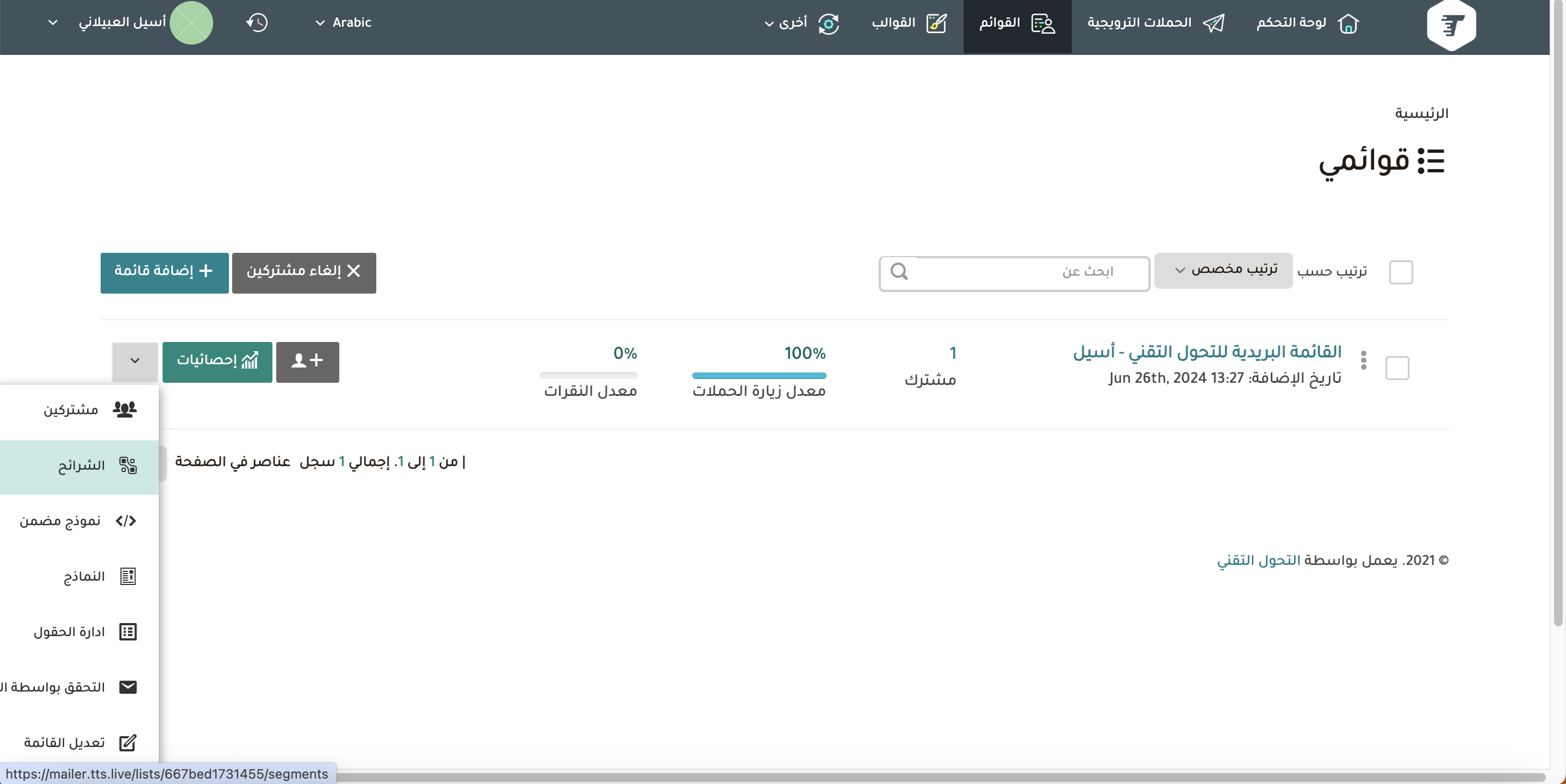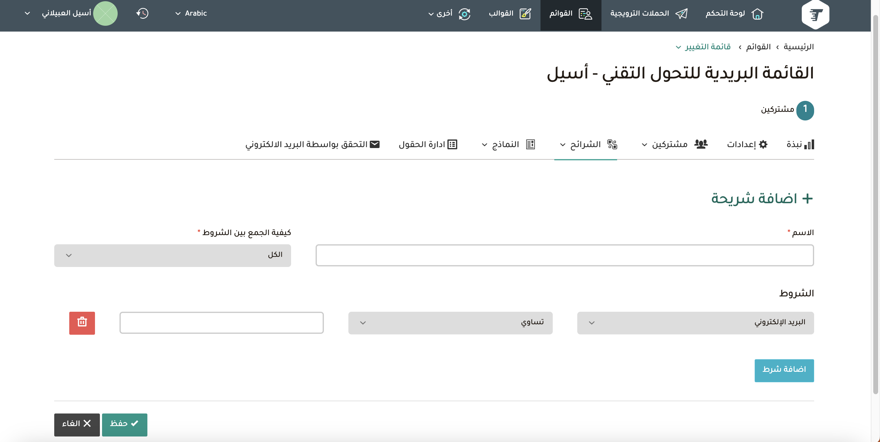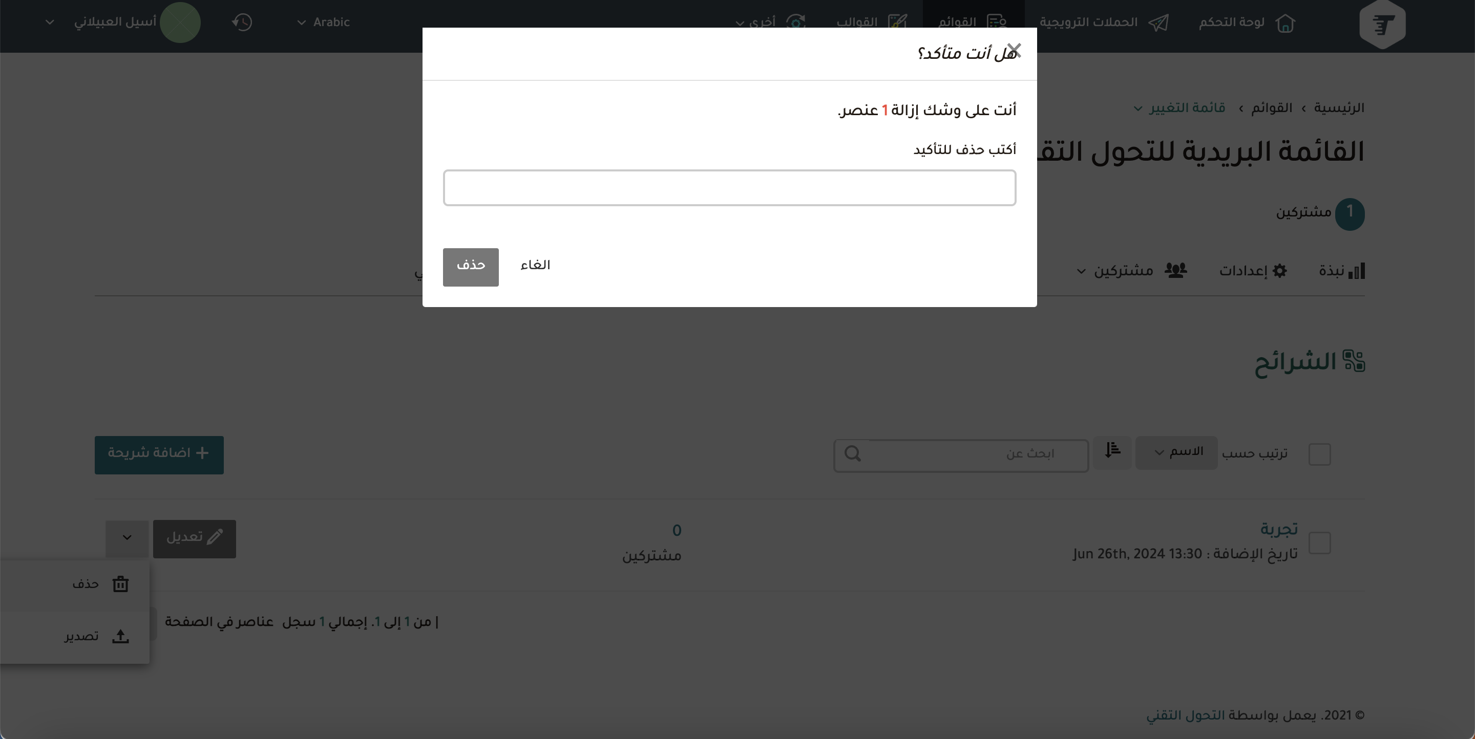 - حذف مشترك: من القائمة العلوية > القوائم > إجراءات على القائمة > المشتركين.