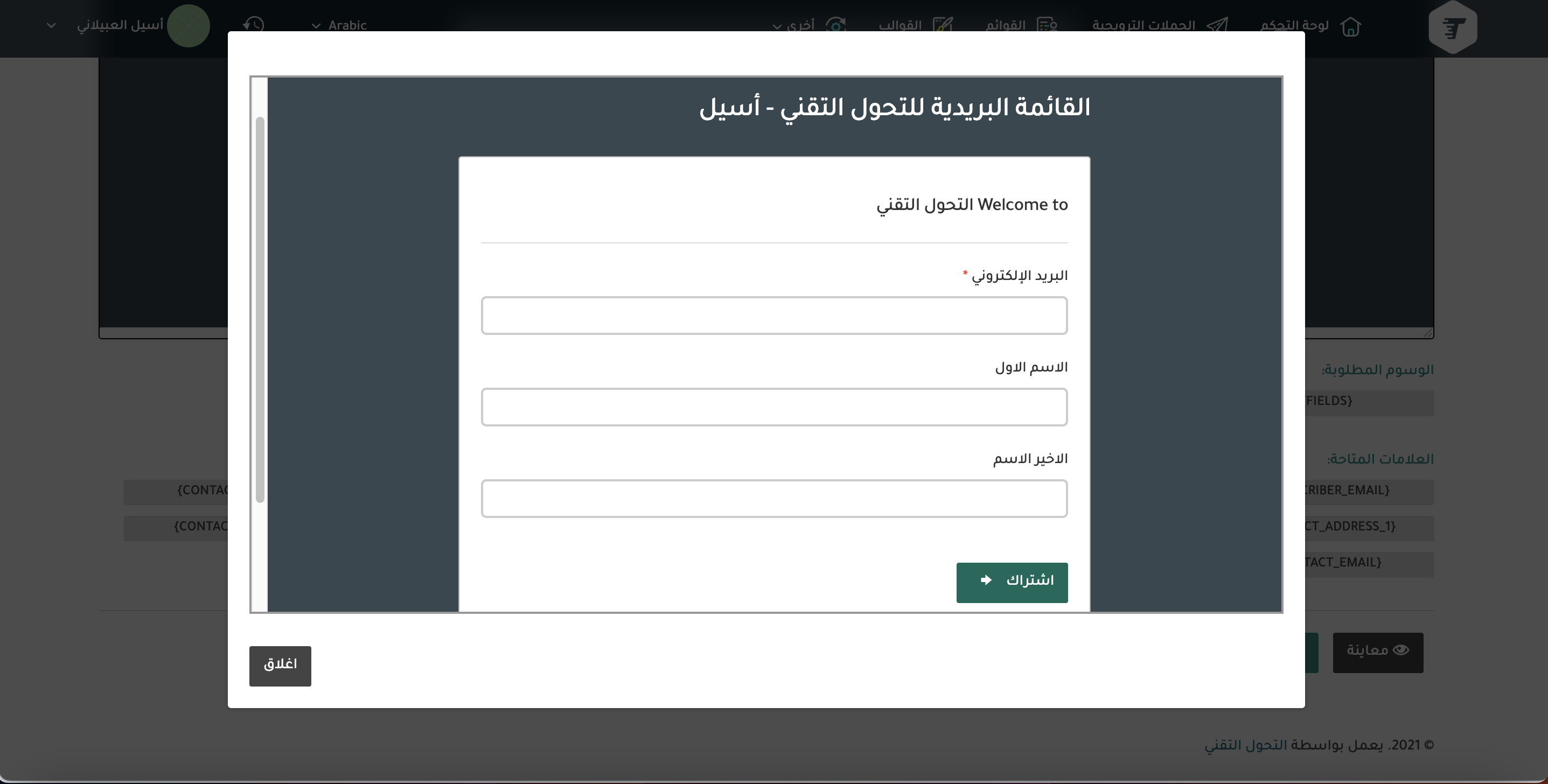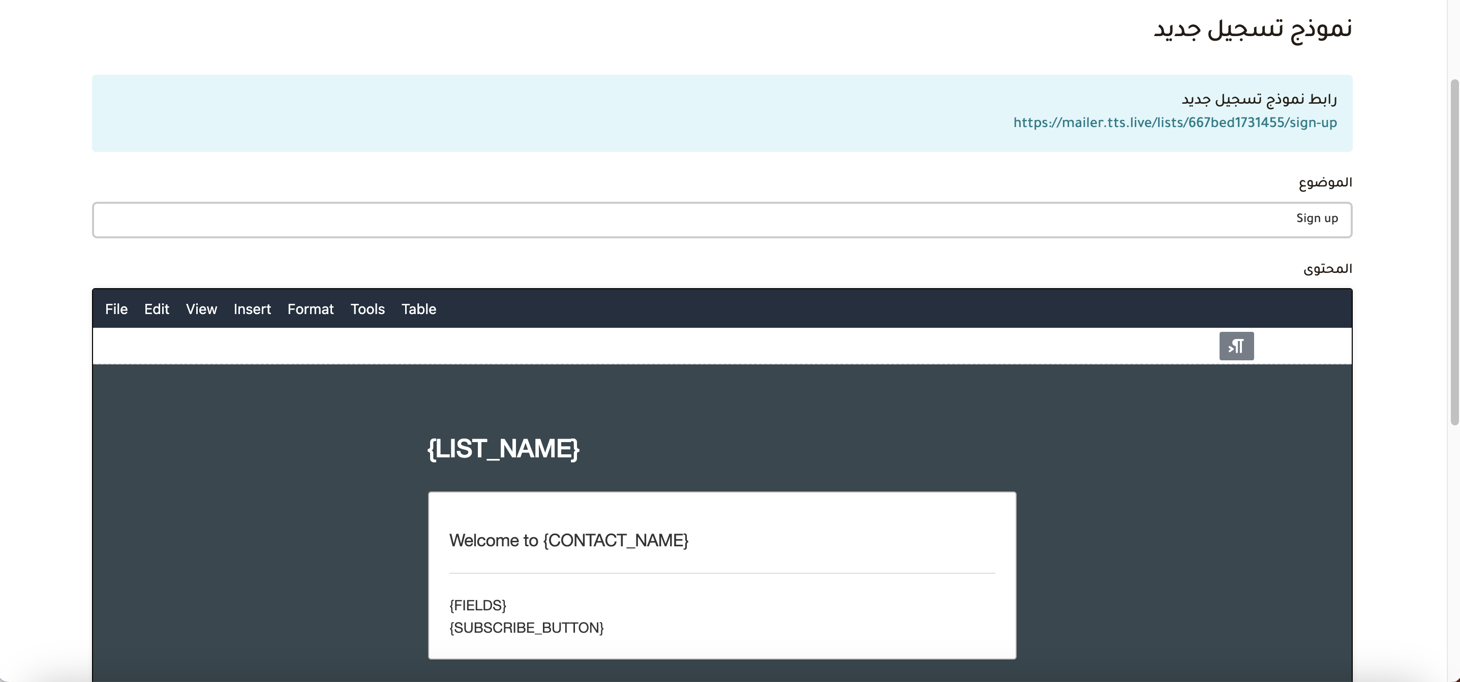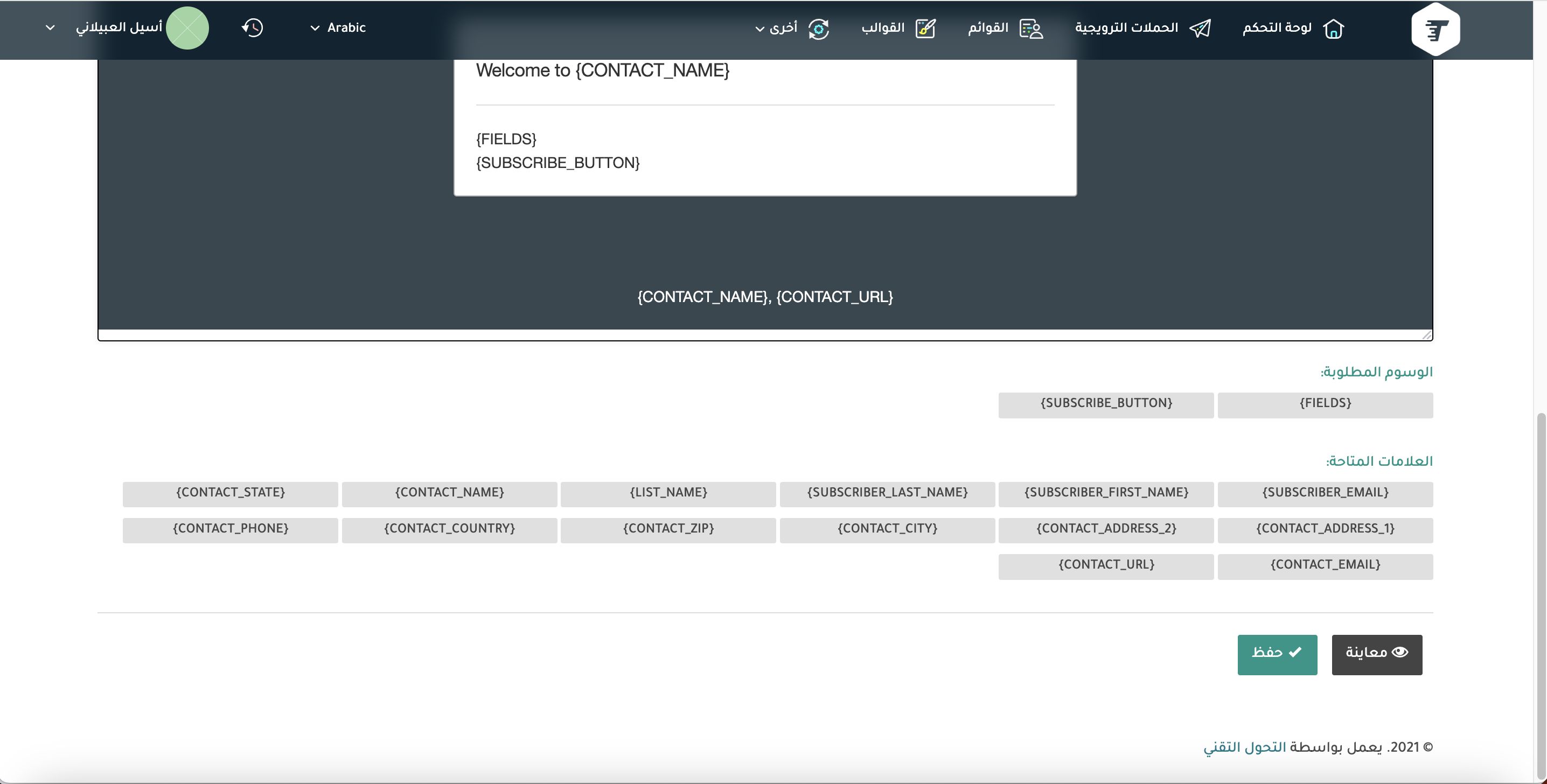 - إدارة محتوى نموذج الرسالة للقائمة البريدية: من القائمة العلوية > القوائم > إجراءات على القائمة.