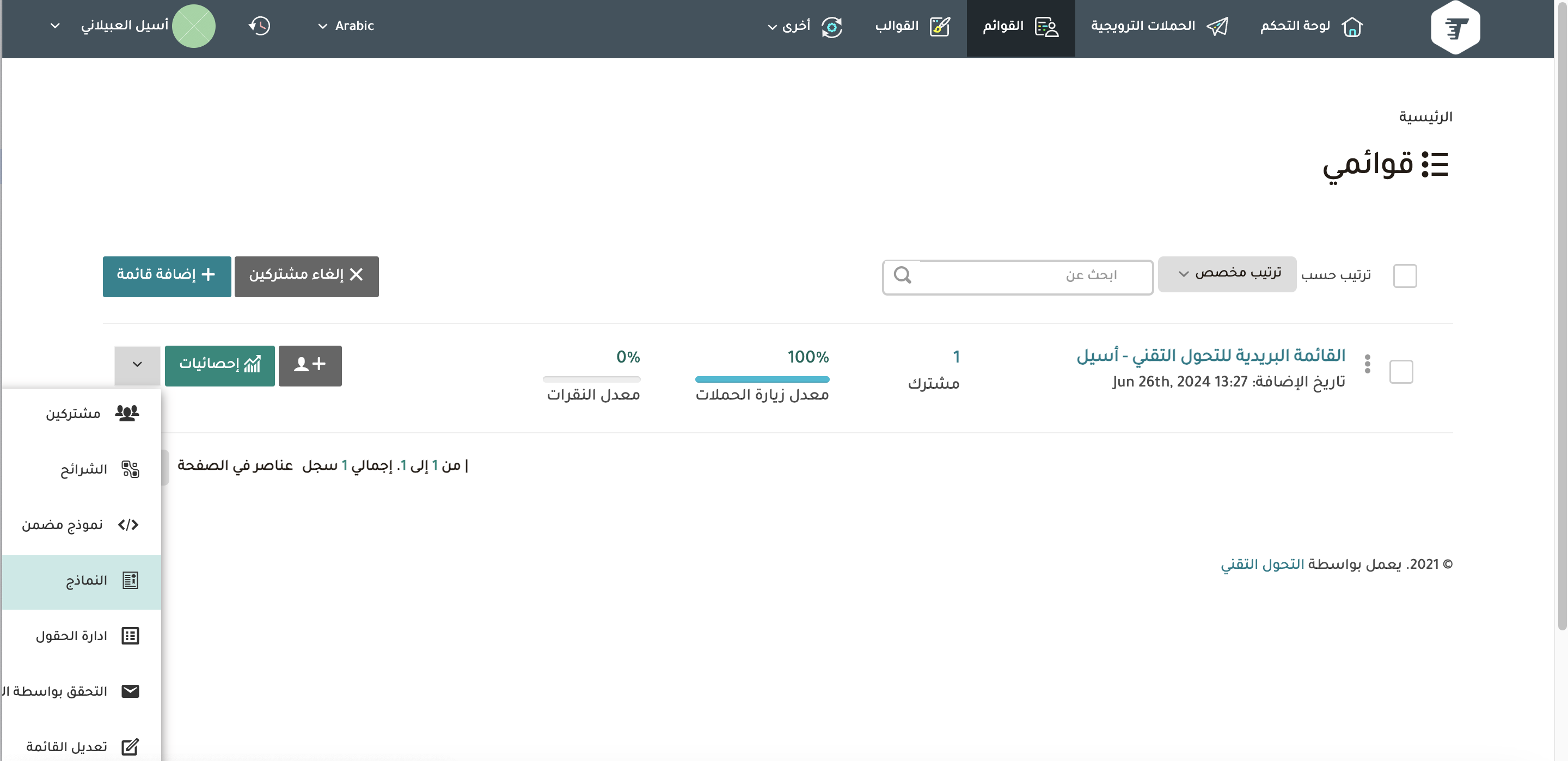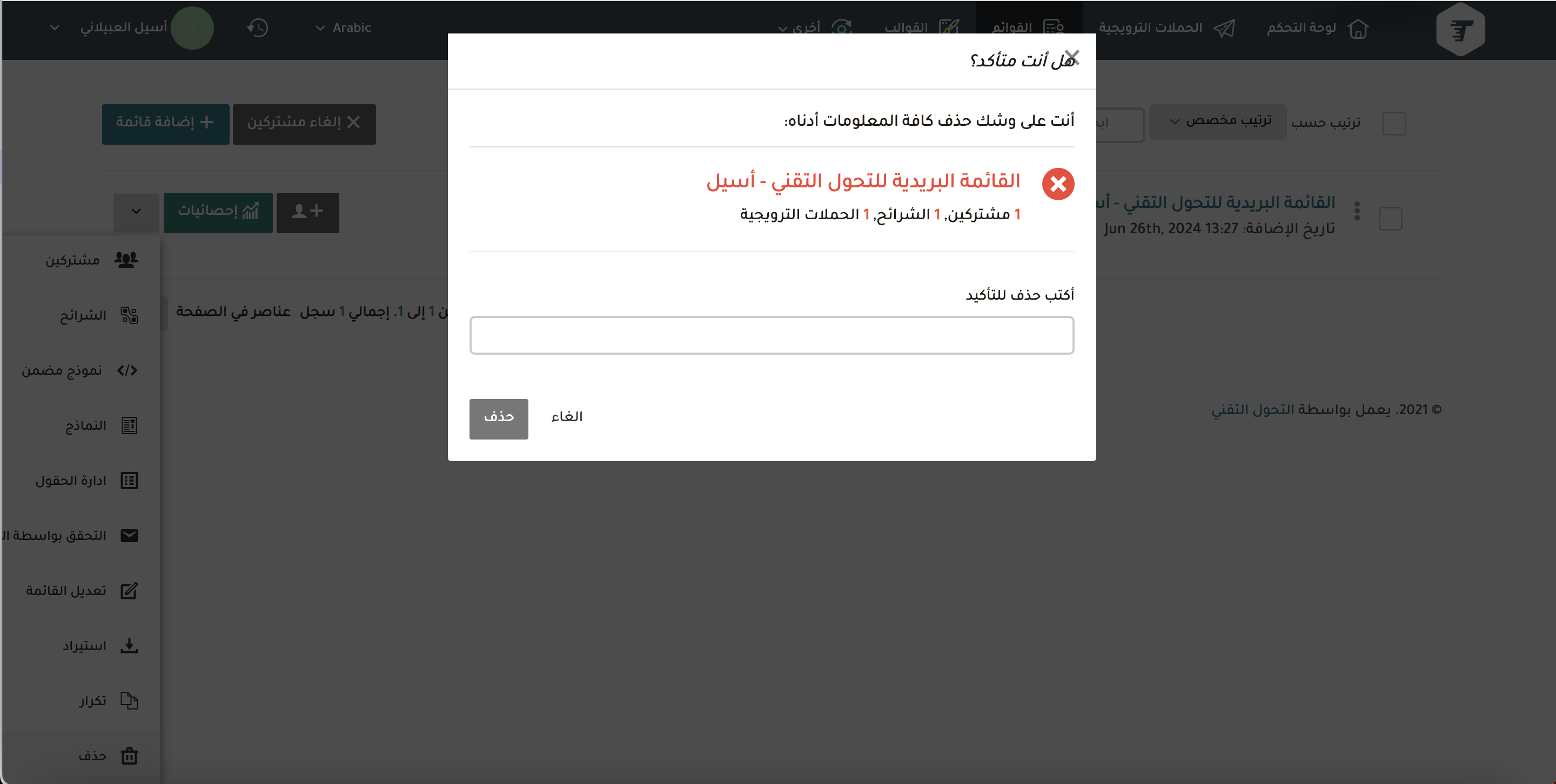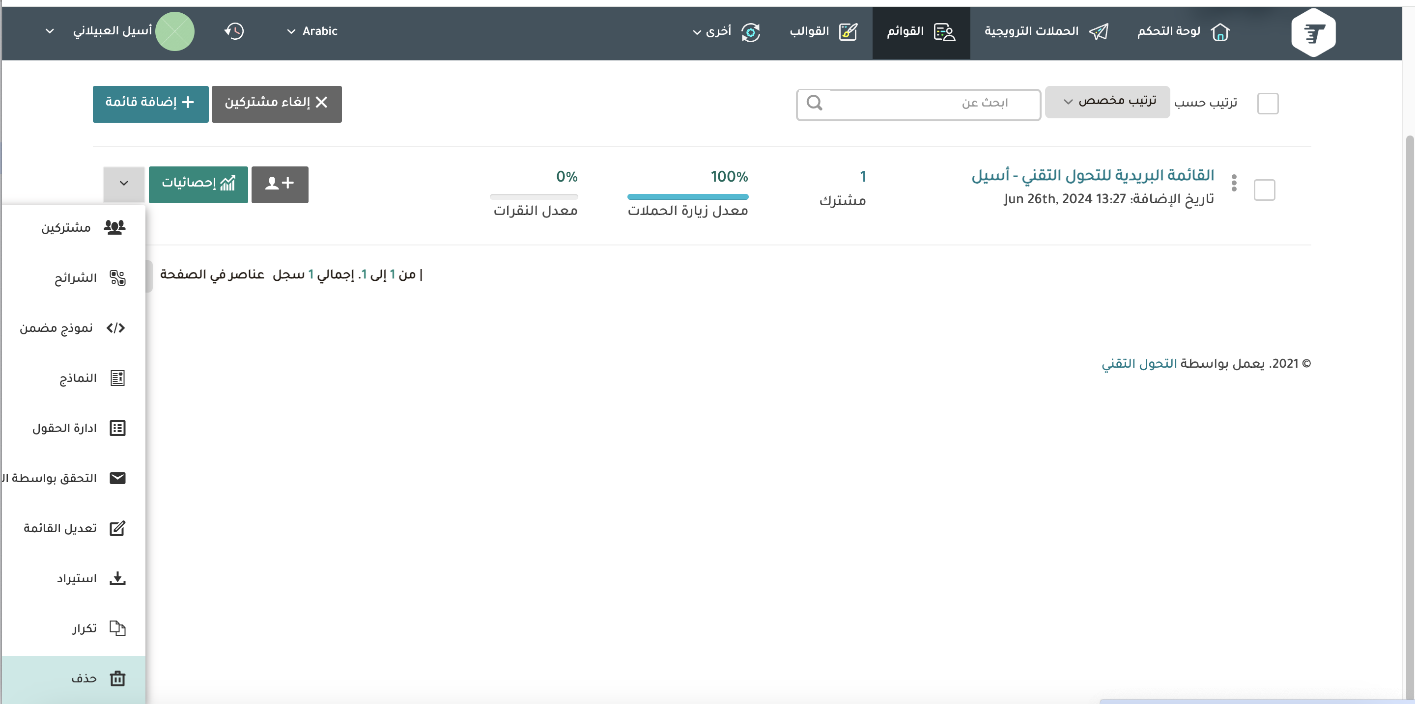 - حذف القائمة البريدية: من القائمة العلوية > القوائم > إجراءات على القائمة.