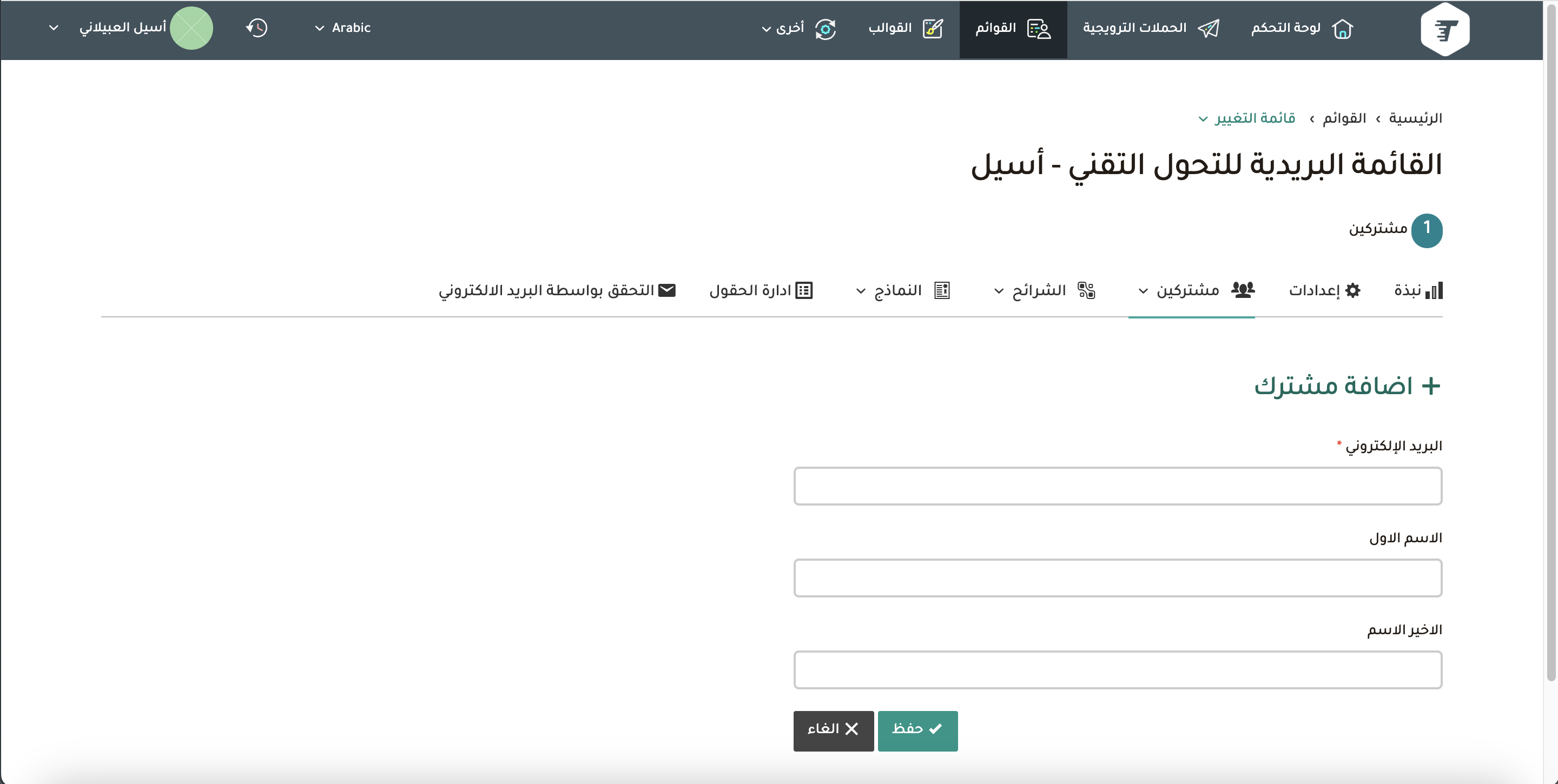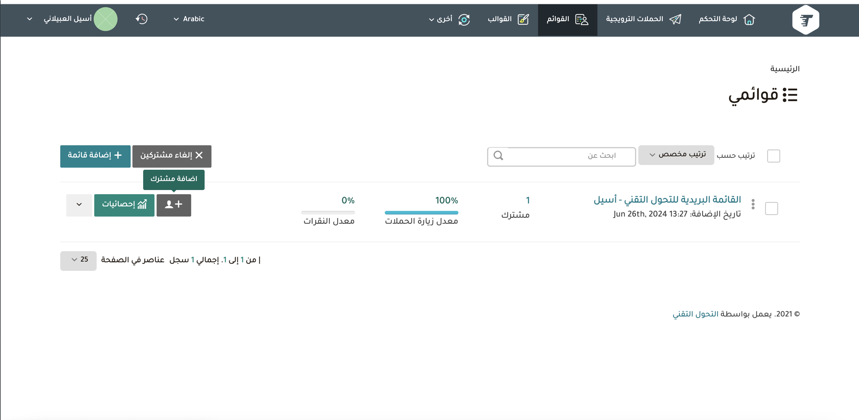 - إضافة مشترك: من القائمة العلوية > القوائم > إجراءات على القائمة.