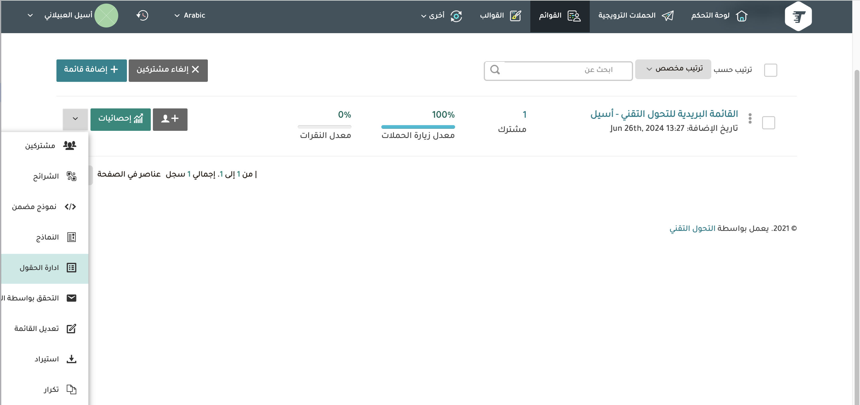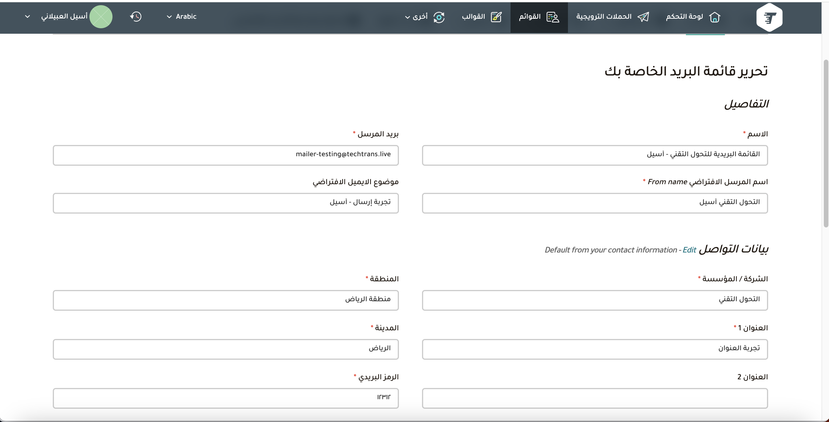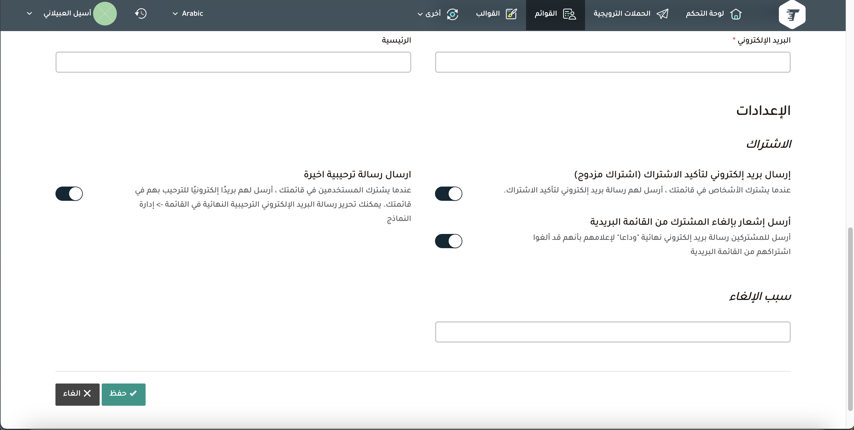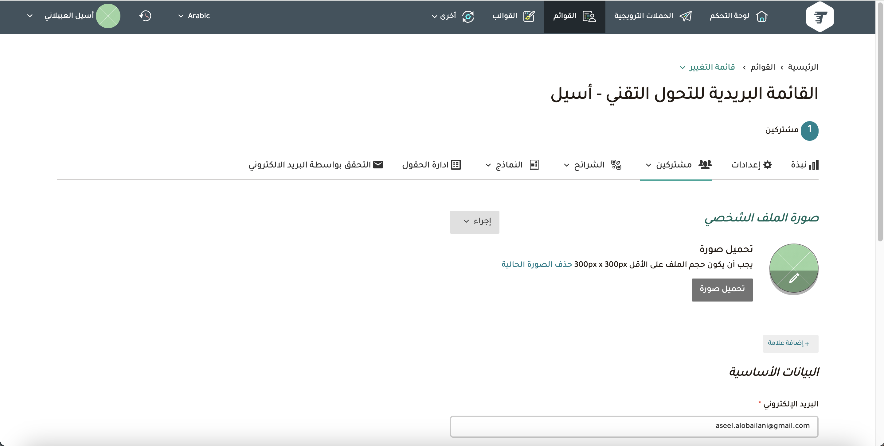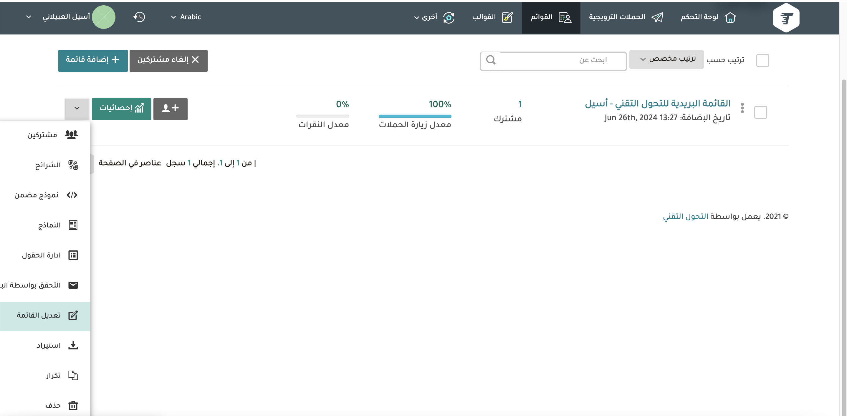 - تعديل القائمة البريدية: من القائمة العلوية > القوائم > إجراءات على القائمة.