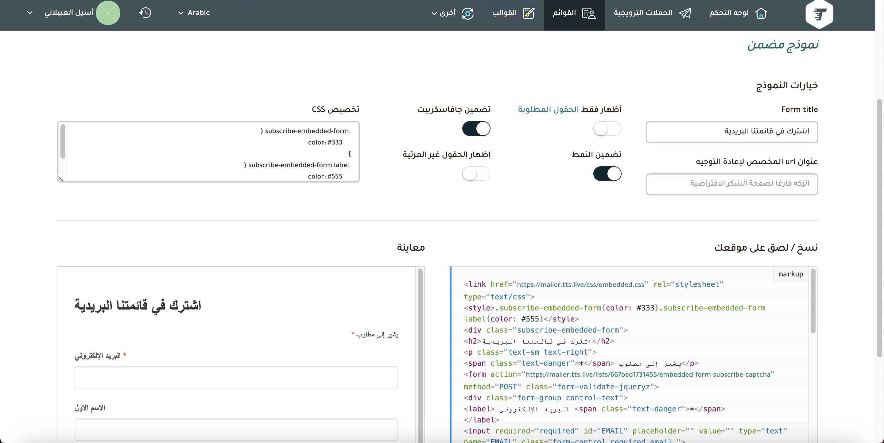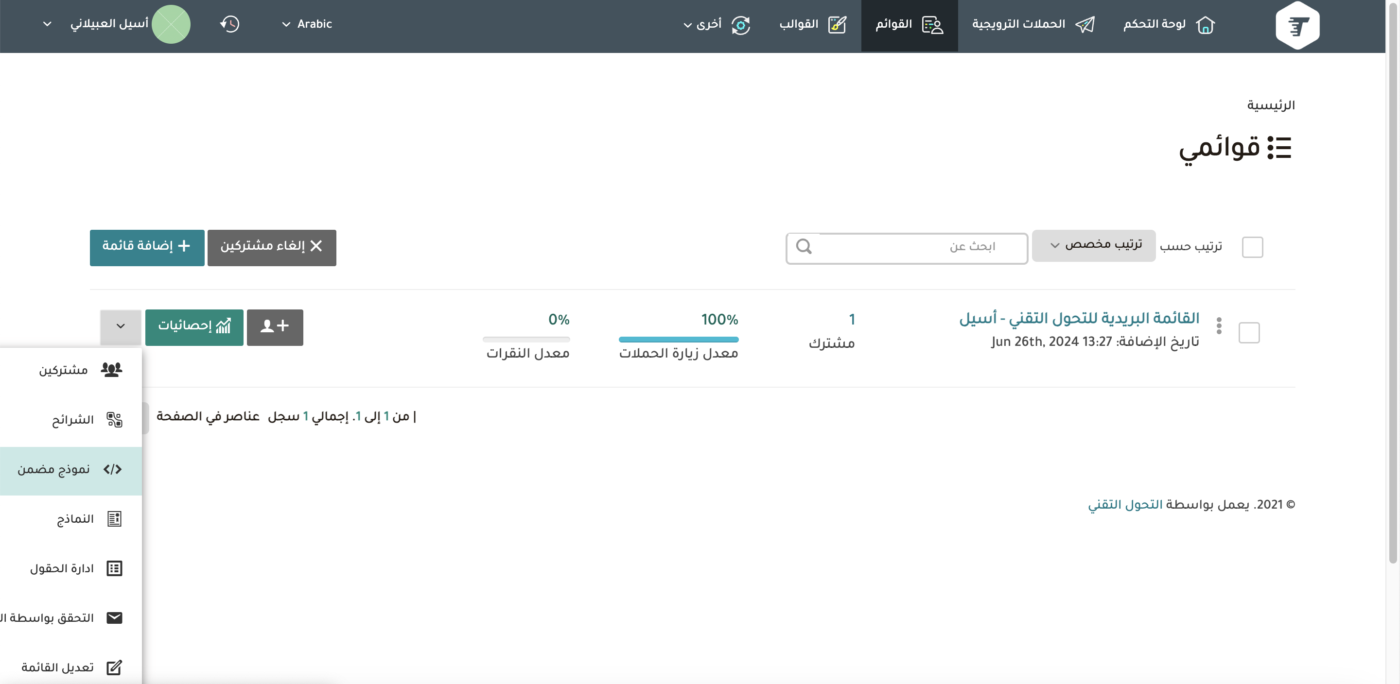 - إضافة نموذج (كود مضمن) HTML لقائمة بريدية محددة: من القائمة العلوية > القوائم > إجراءات على القائمة.
