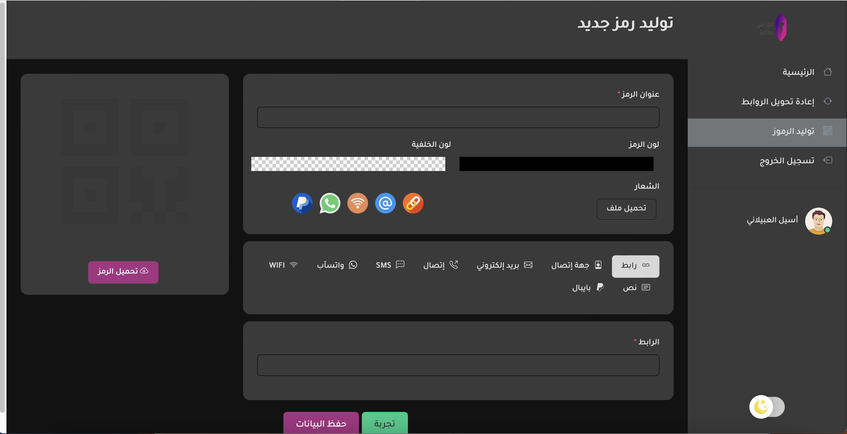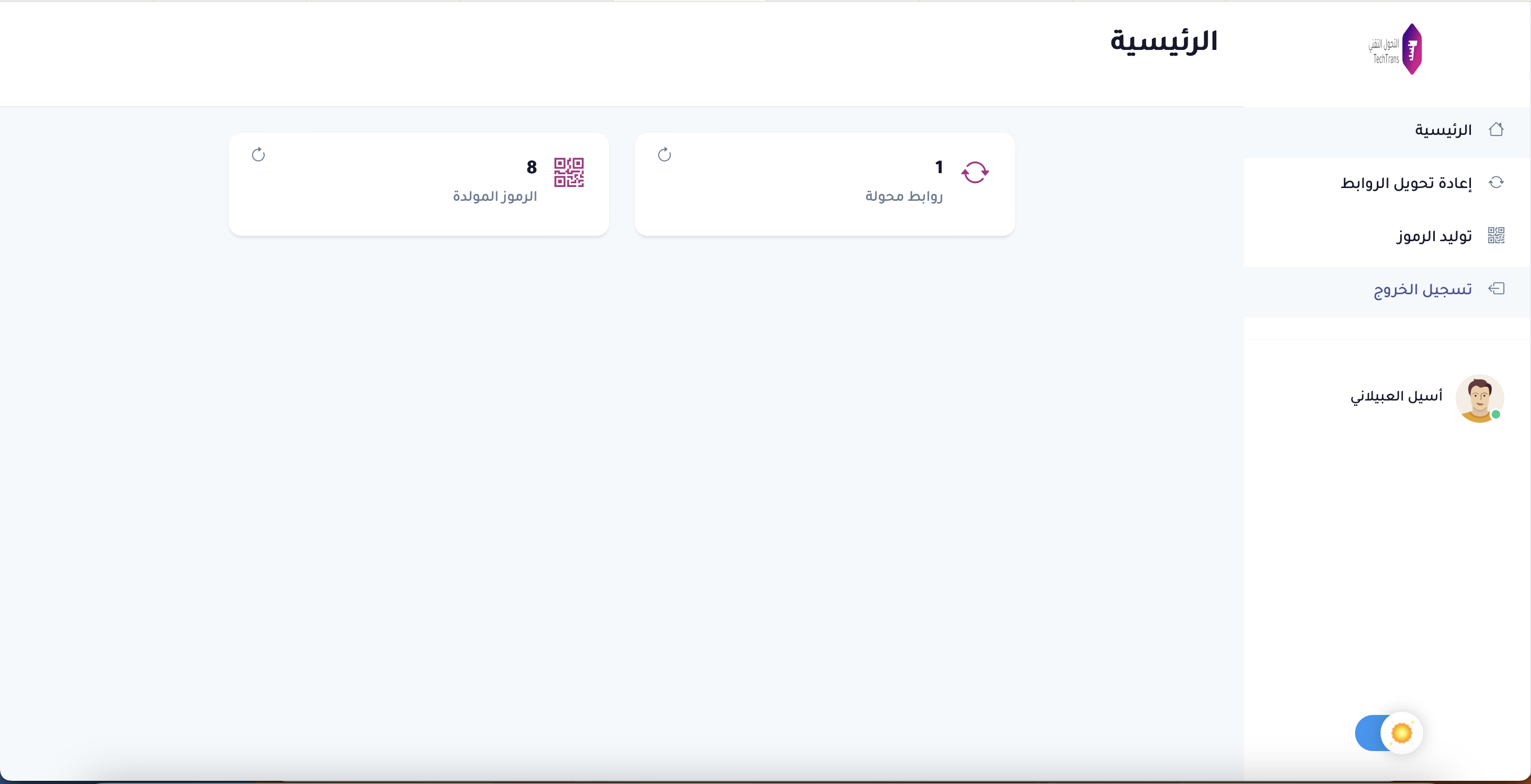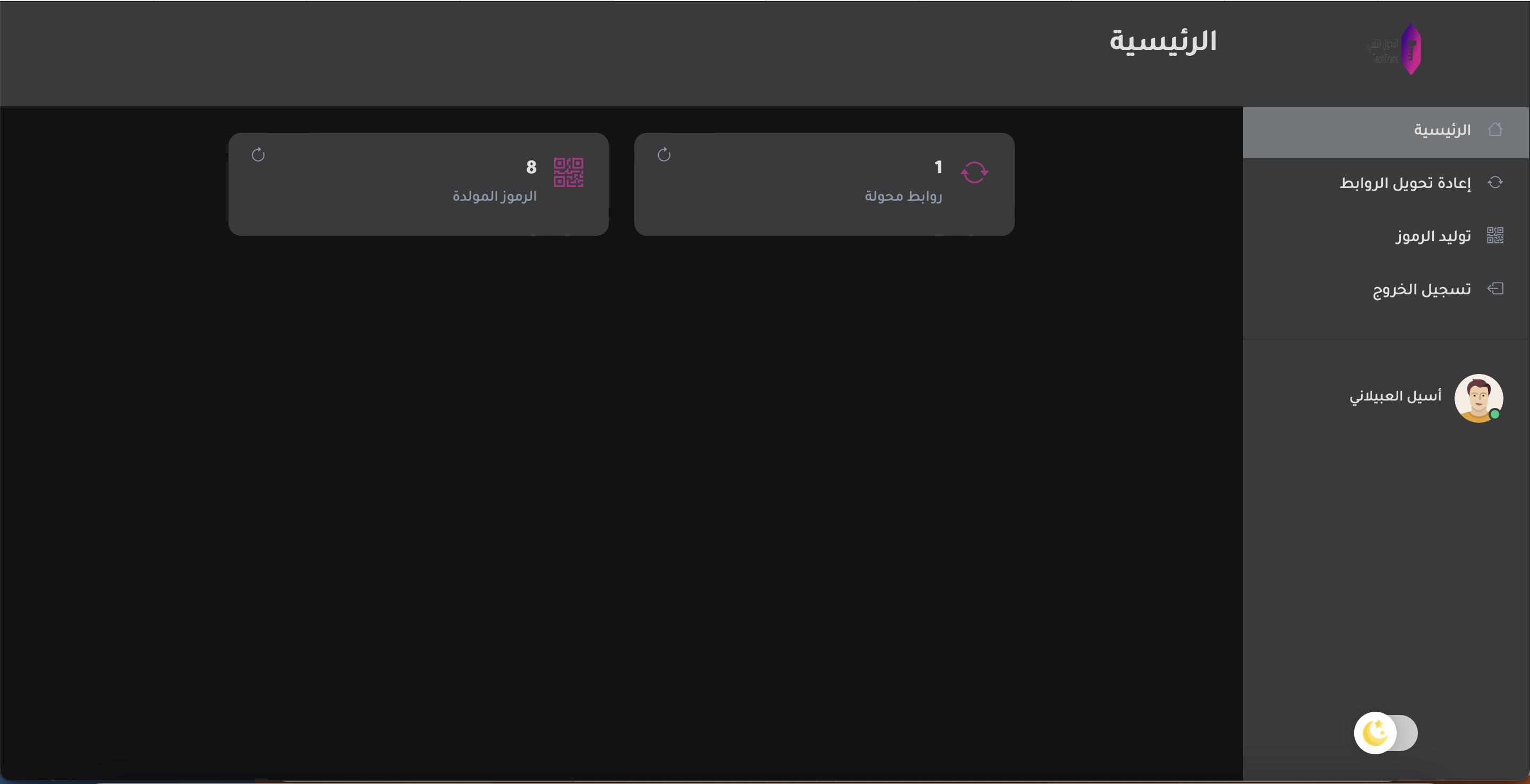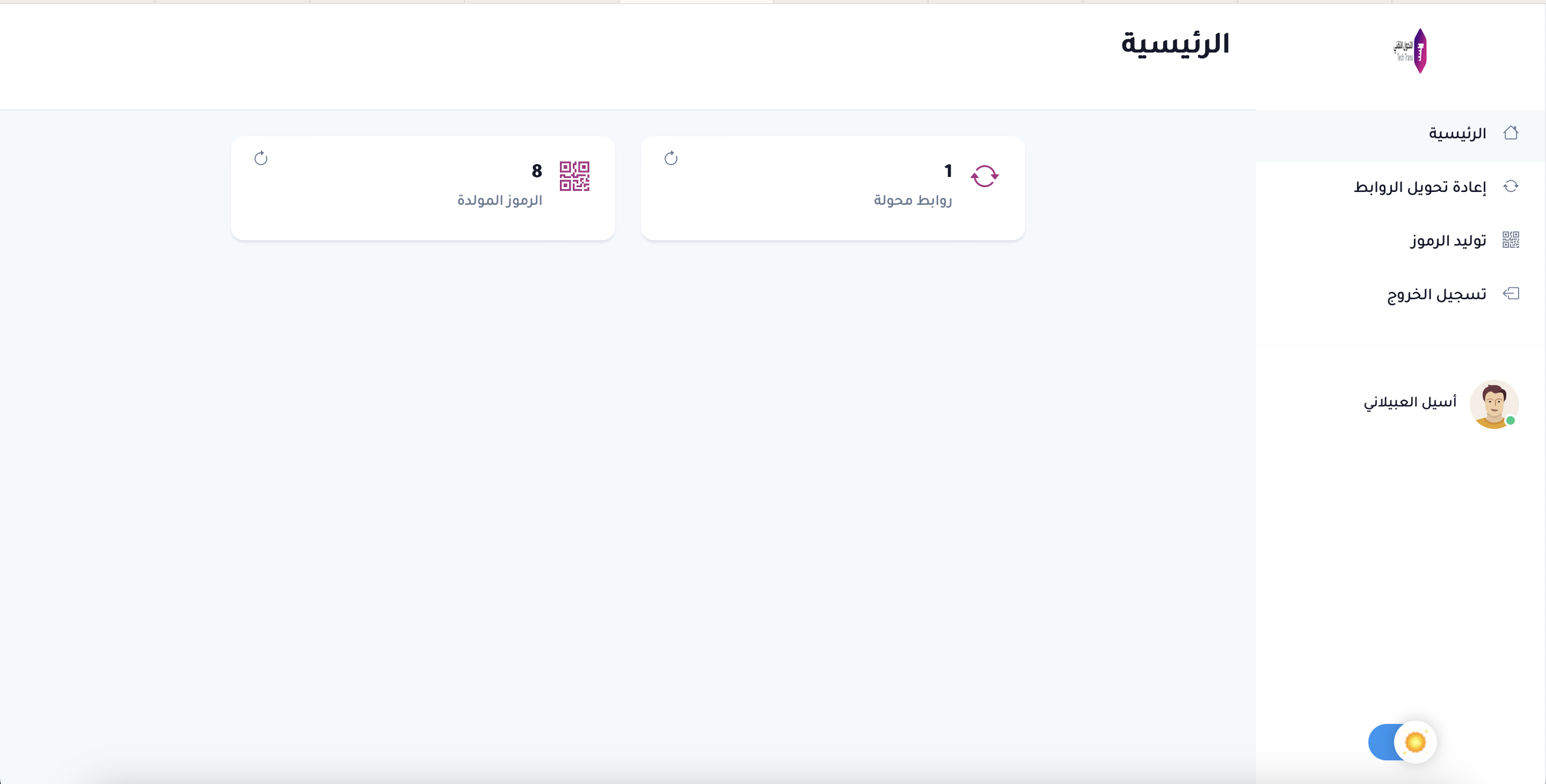 - الصفحة الرئيسية يتم عرض إحصائيات بعدد الروابط المحولة والرموز المولدة عن طريقك: