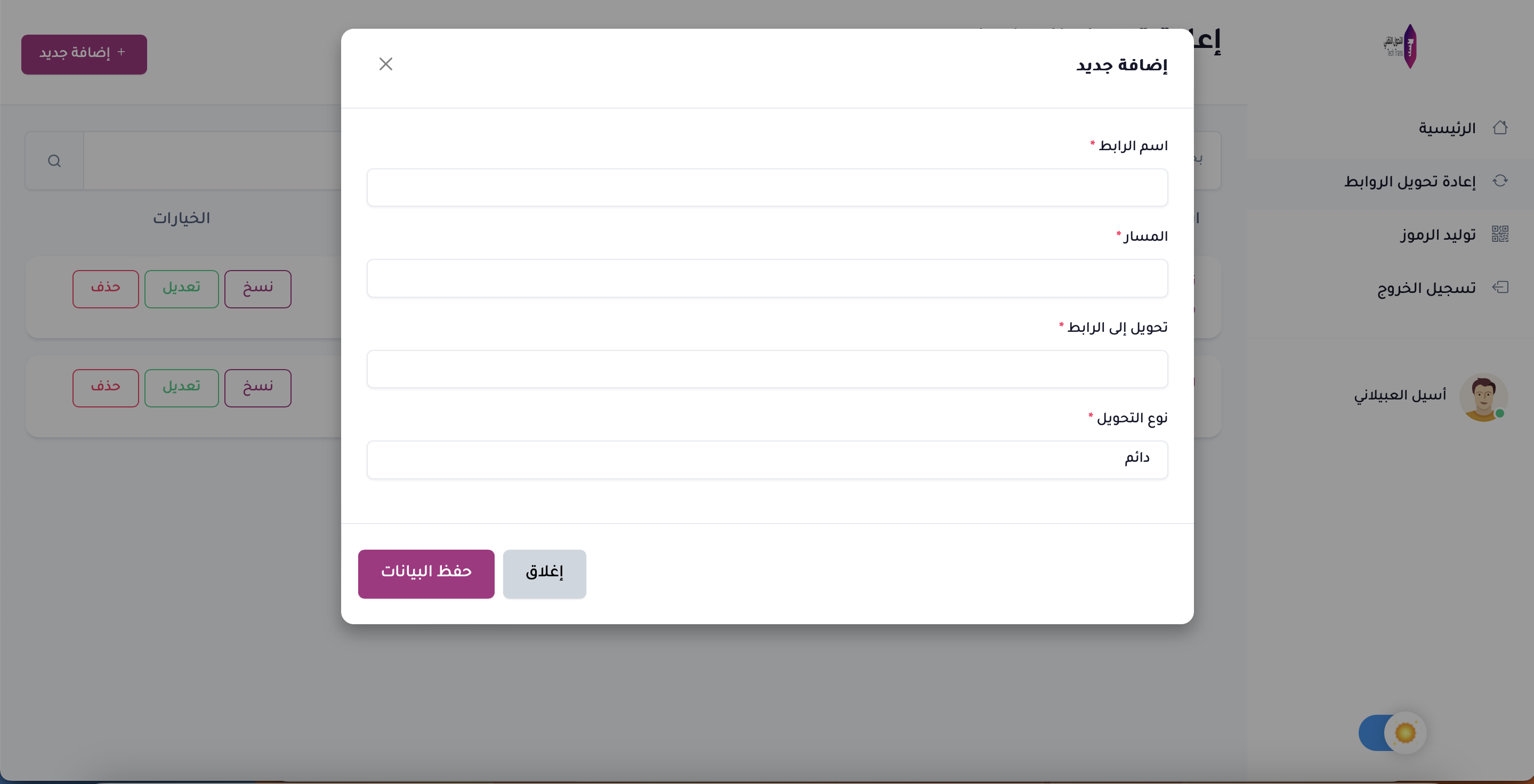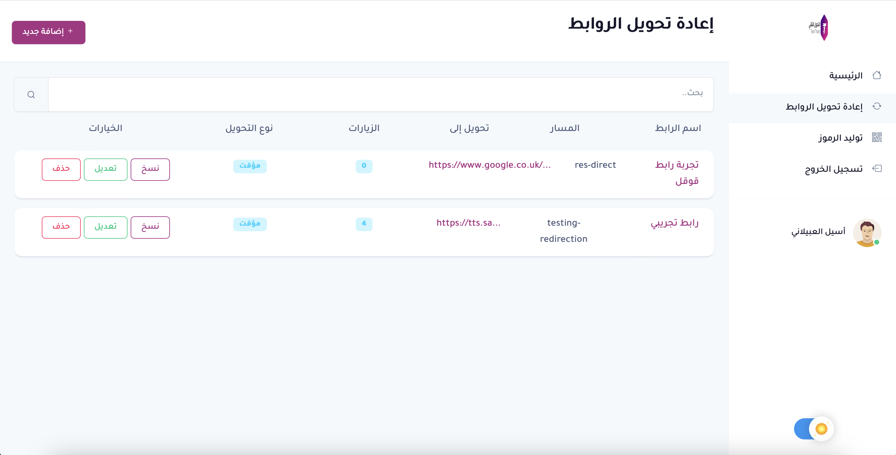 - إعادة تحويل الروابط: يتم عرض جدول يوضح الروابط التي تمت إضافتها وعدد الزيارات ونوع التحويل ويمكنك:
