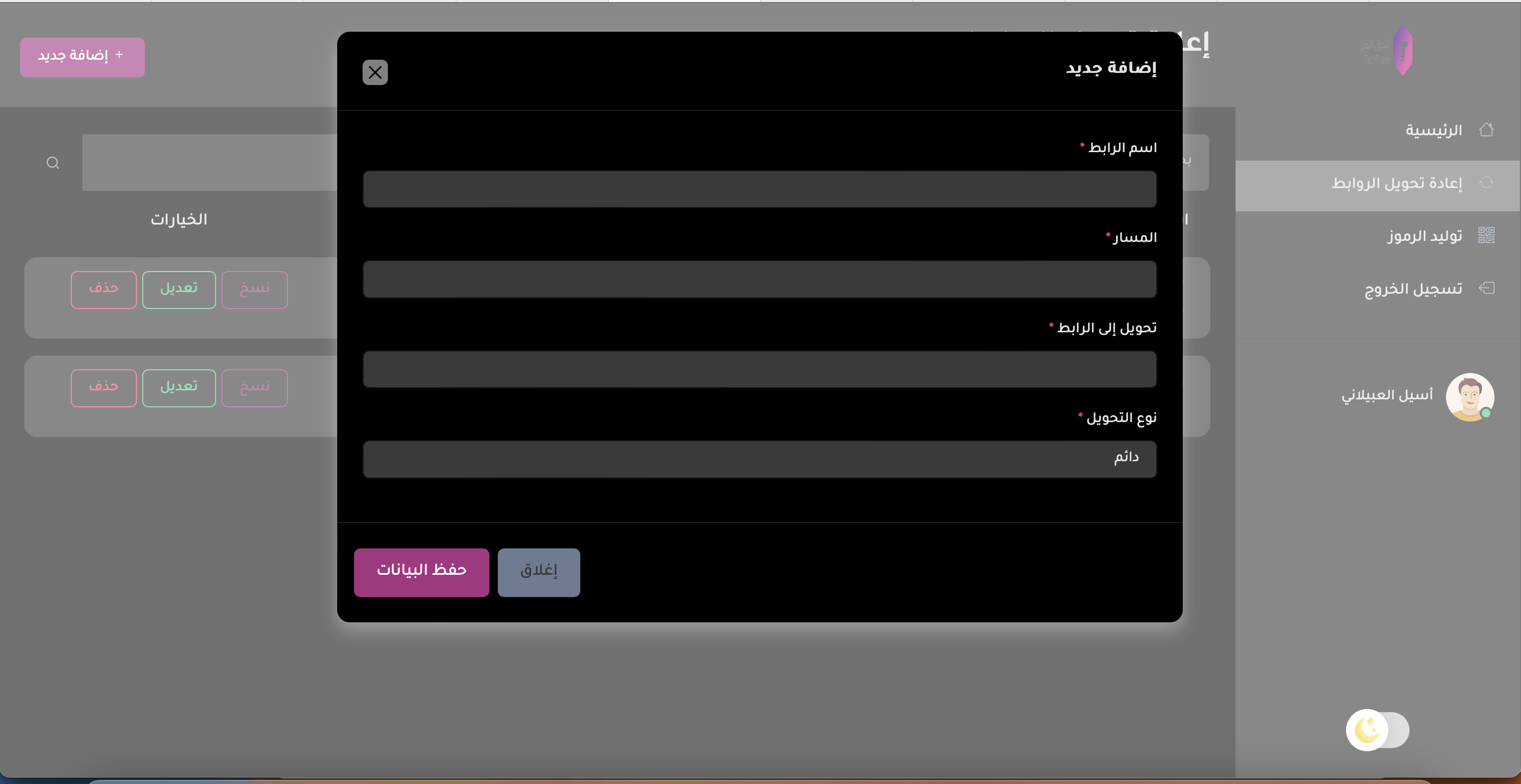 - إضافة رابط: عن طريق زر إضافة جديد ثم تعبئة الحقول التالية: