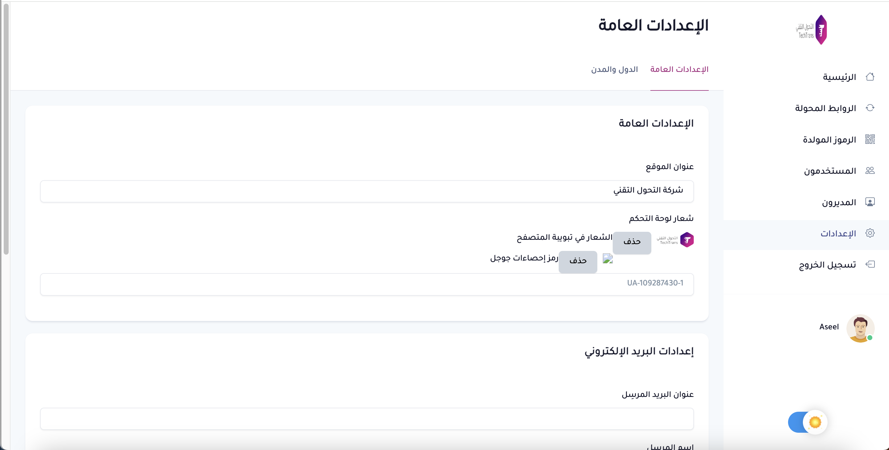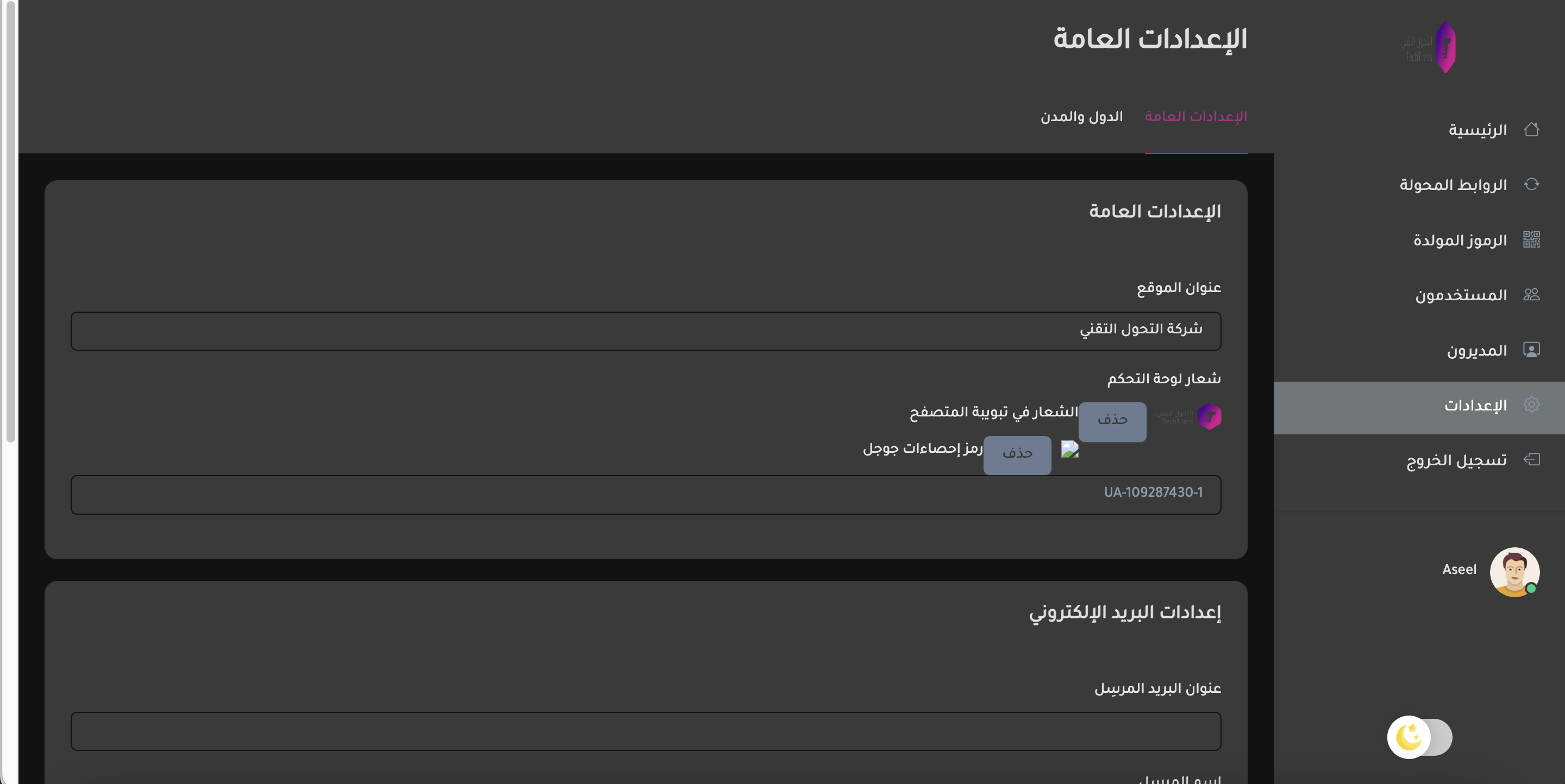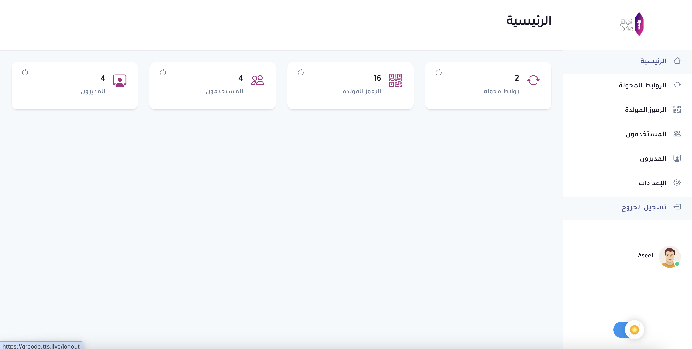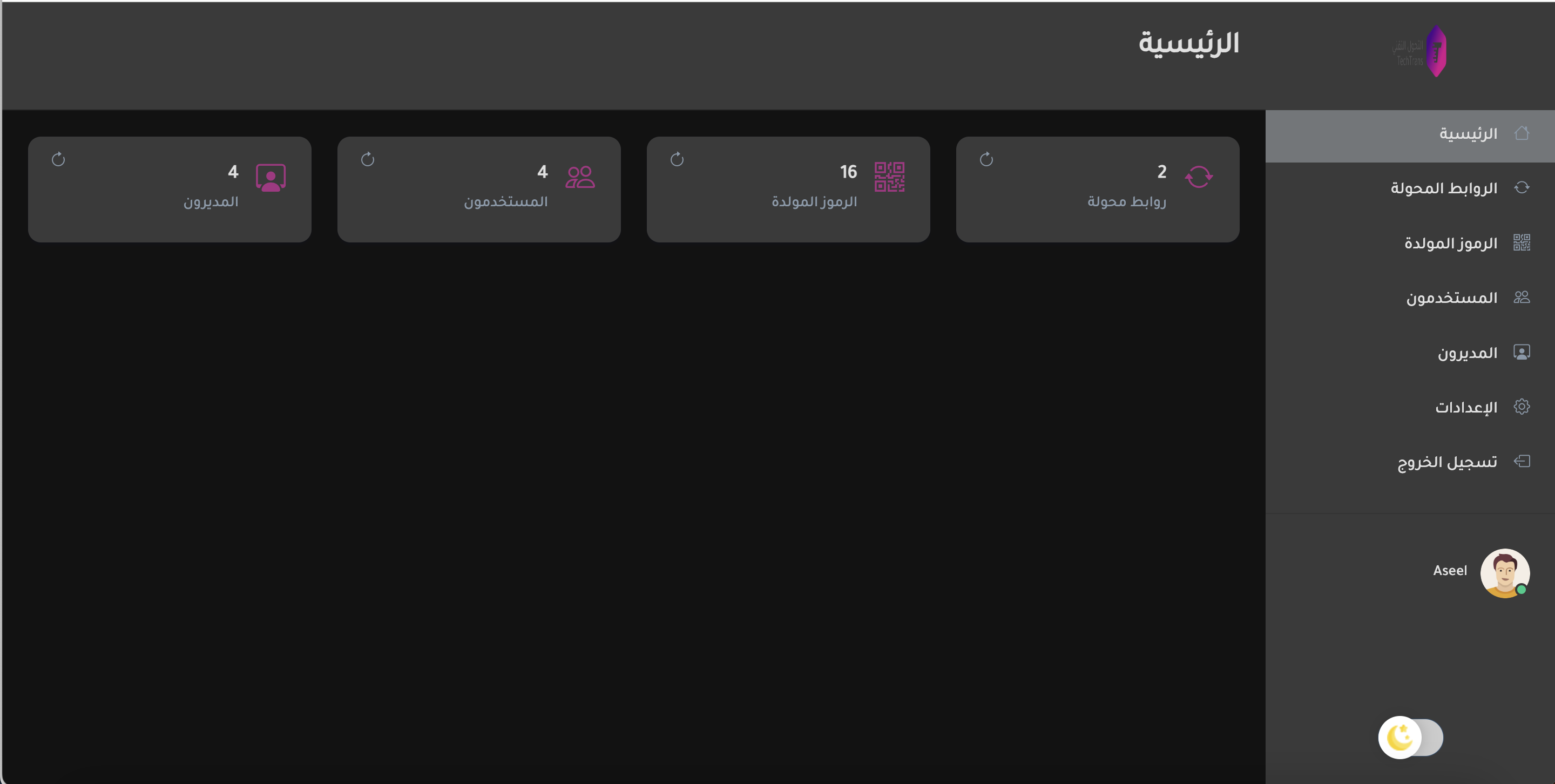 - الصفحة الرئيسية يتم عرض إحصائيات بعدد الروابط المحولة والرموز المولدة والمستخدمون والمديرون: