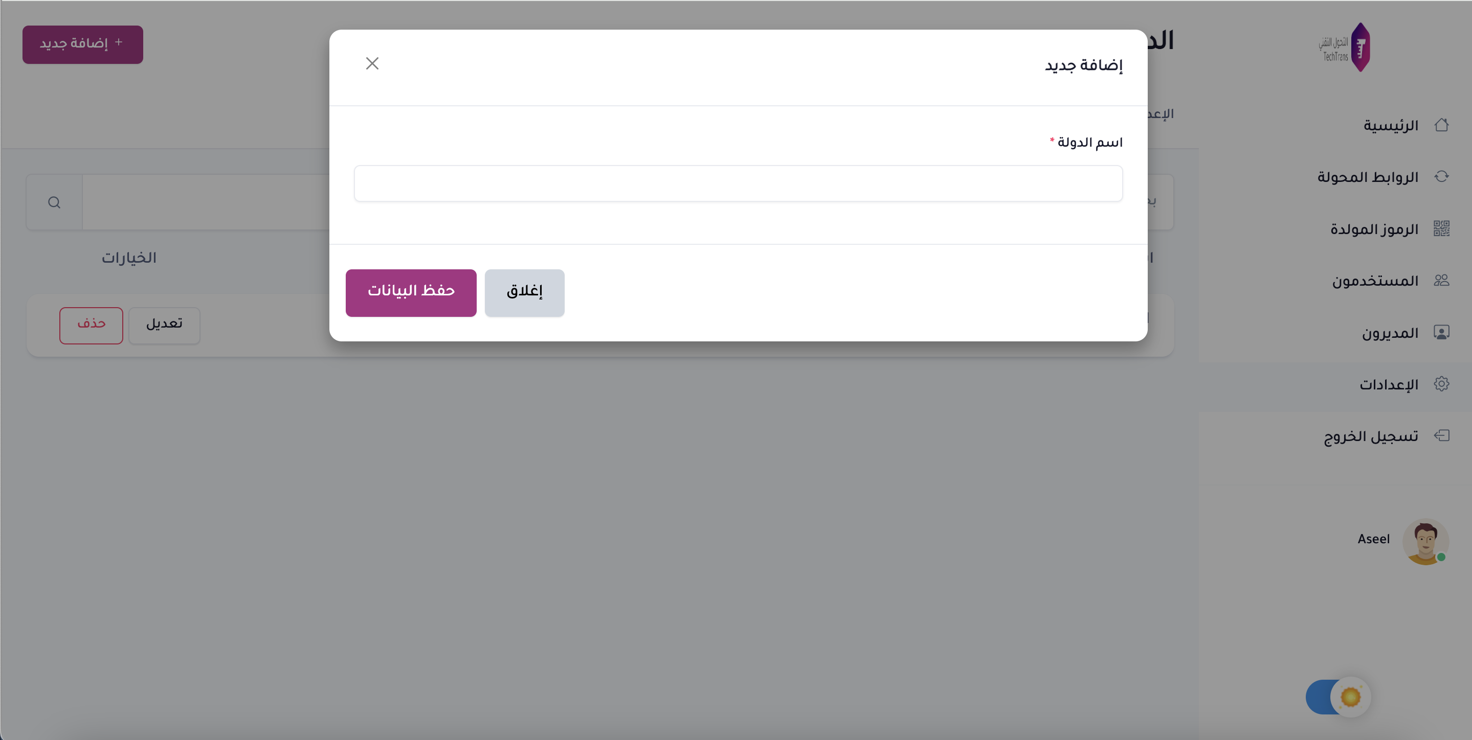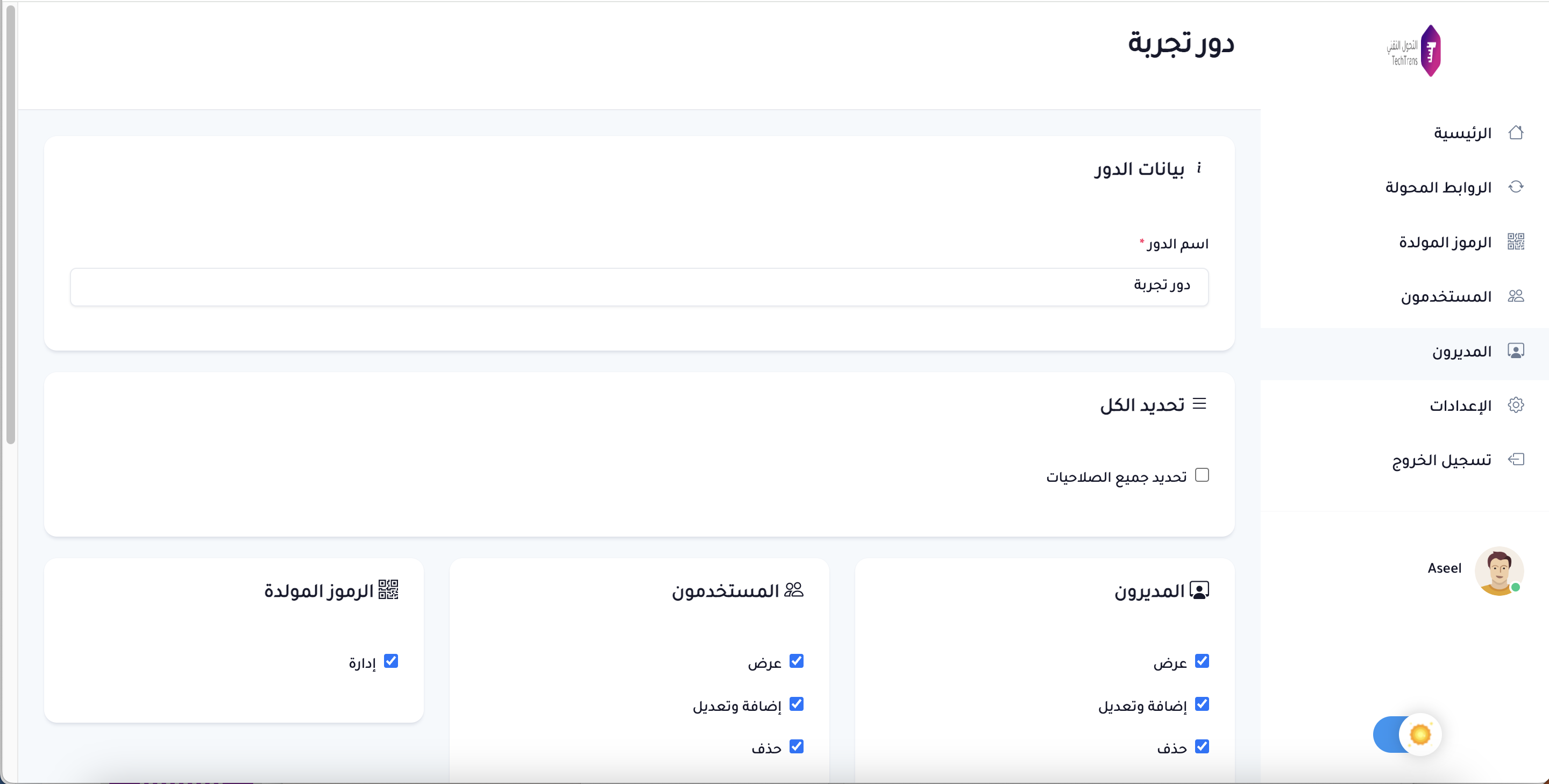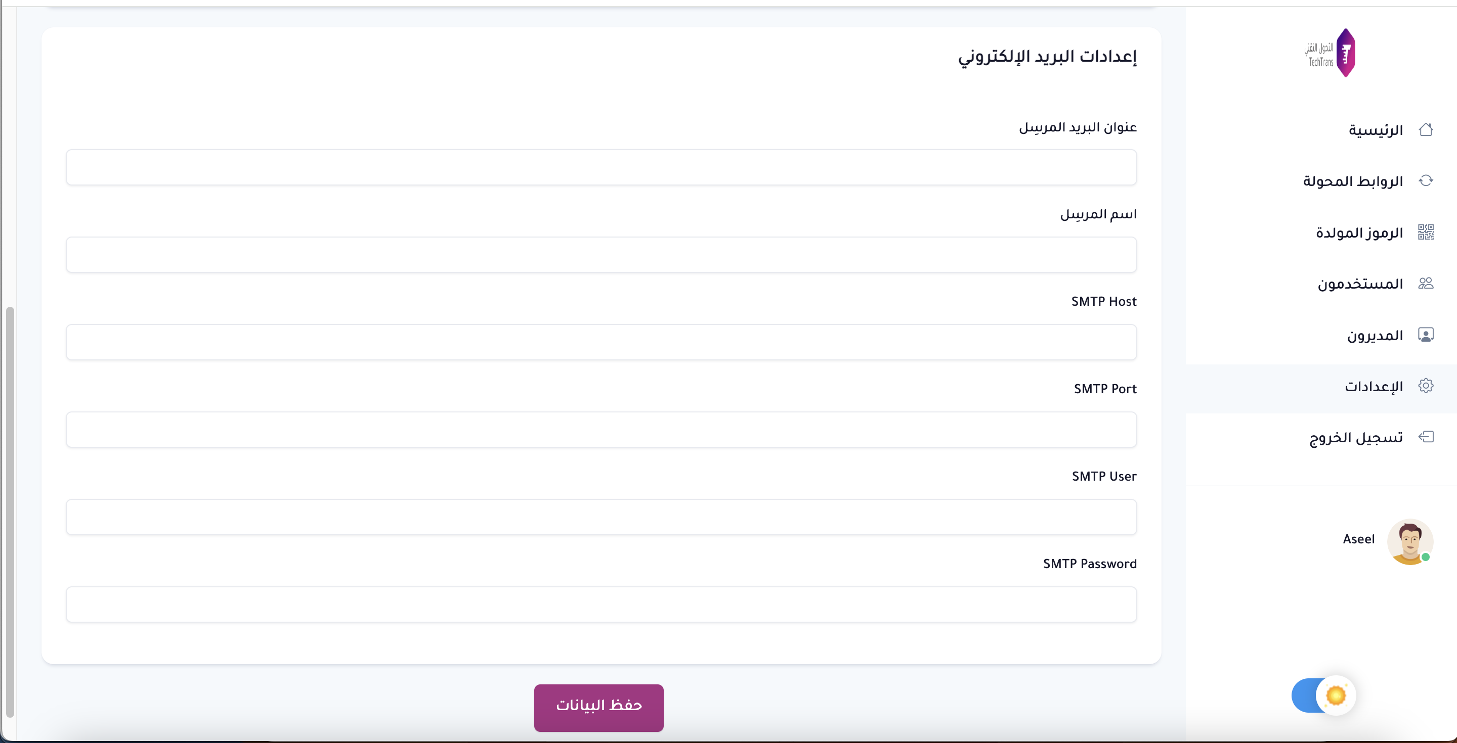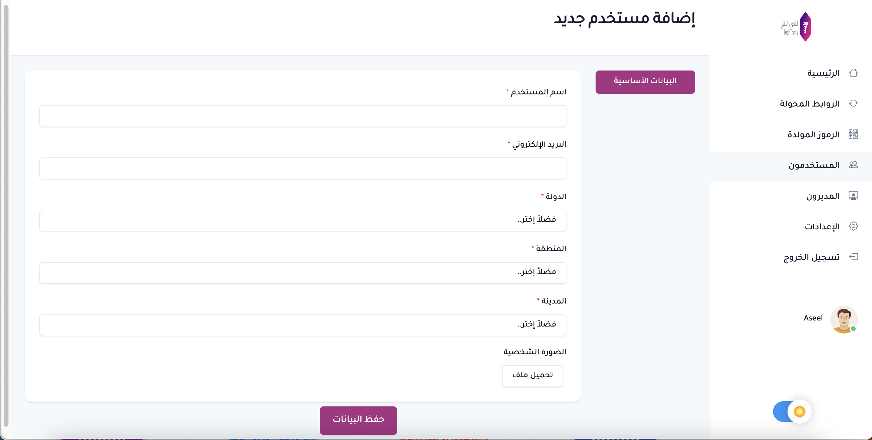 - الصفحة الرئيسية يتم عرض إحصائيات بعدد الروابط المحولة والرموز المولدة والمستخدمون والمديرون: