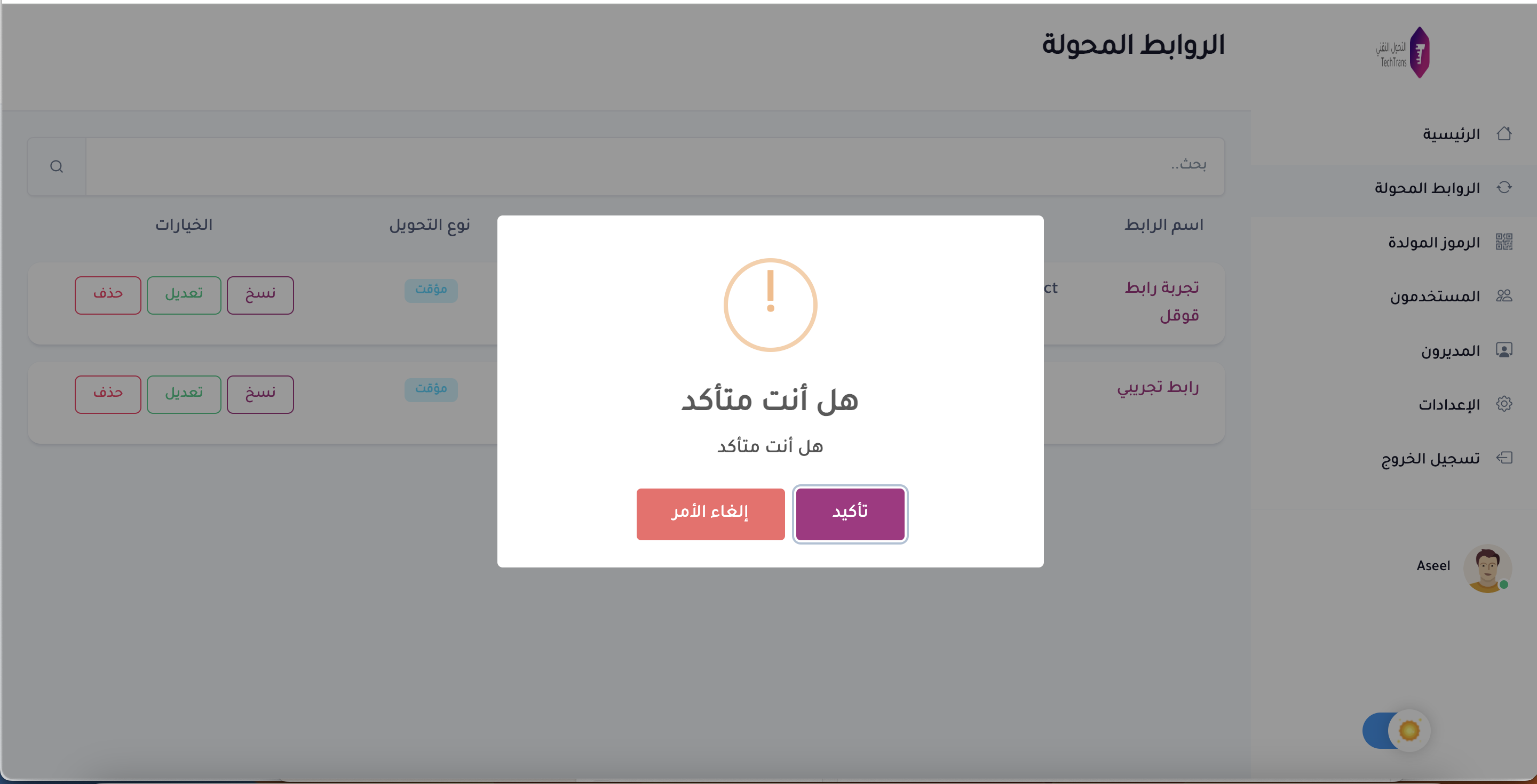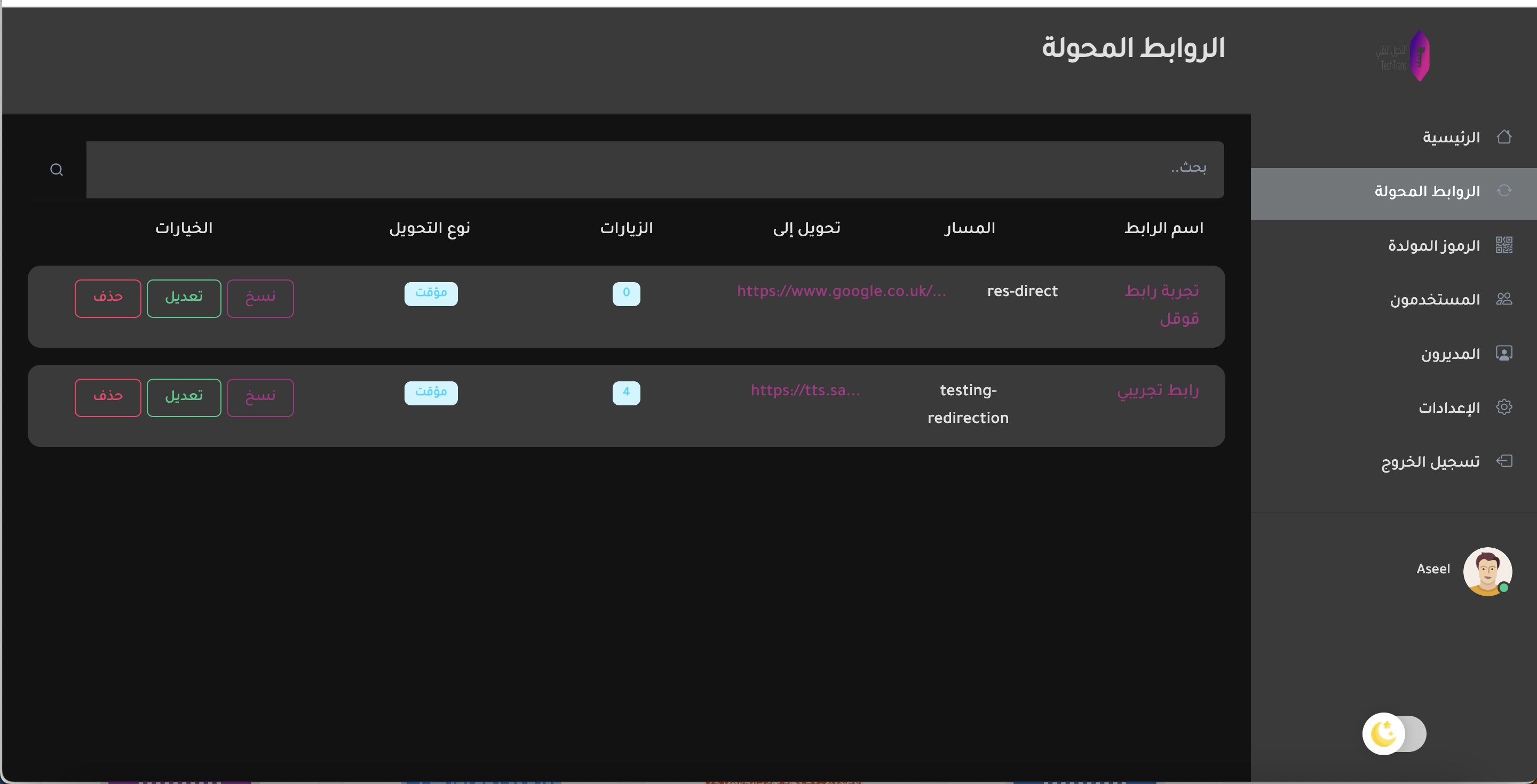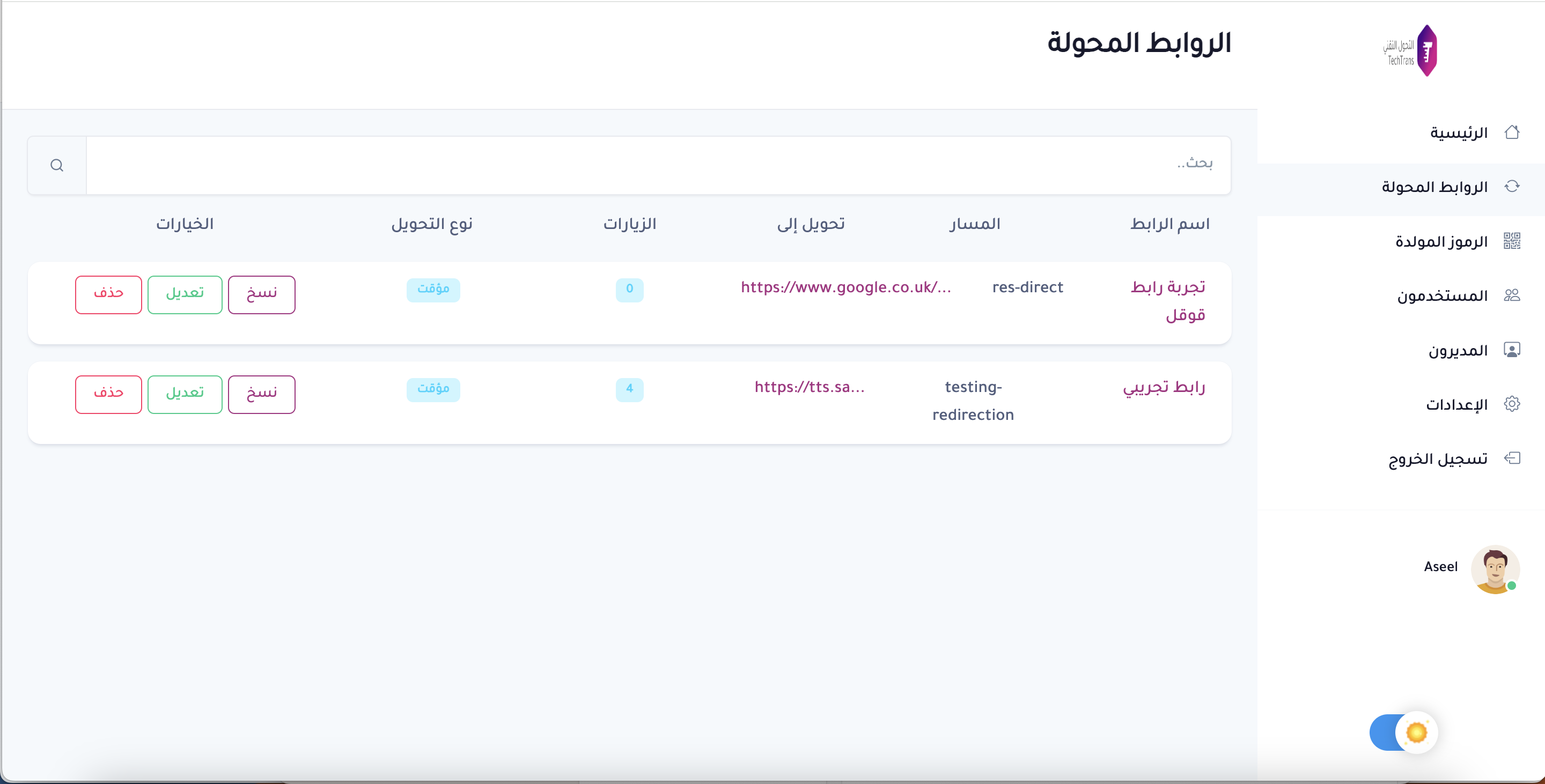 - يتم عرض الروابط المحولة والرموز المولدة التي تمت من خلال المستخدم